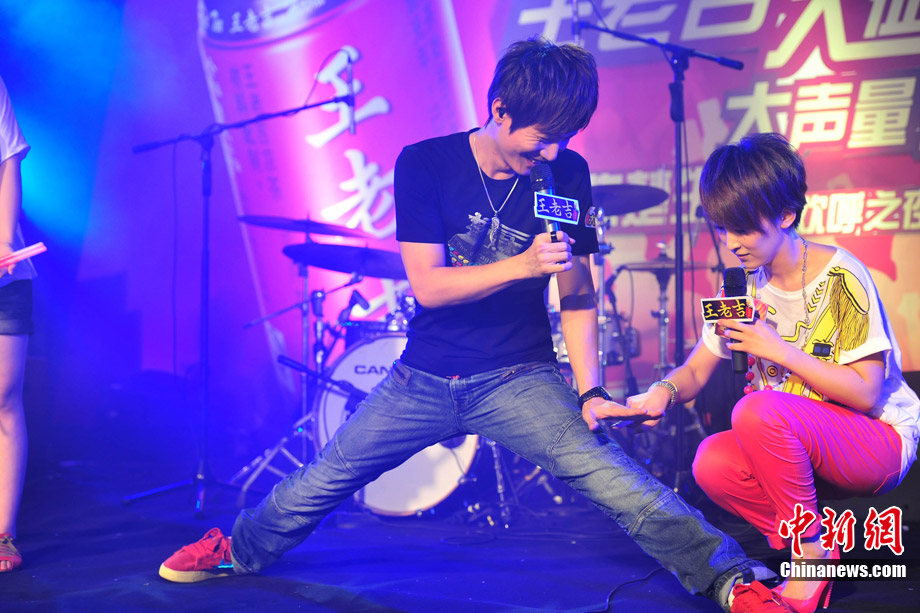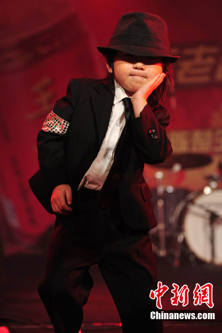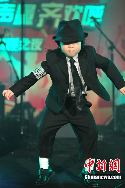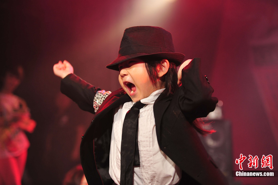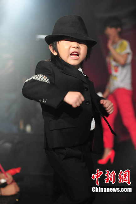 7月18日晚,陳楚生北京歌友會勁爆上演。4歲的街舞神童“小寶”王一鳴現(xiàn)場為陳楚生助陣!靶殹蹦昙o雖小,卻是位舞蹈天才,曾得到MJ舞蹈老師的肯定。他模仿MJ的經(jīng)典舞步熱翻全場,贏得現(xiàn)場粉絲陣陣尖叫,風頭大有蓋過陳楚生之意!靶殹斌@人的舞蹈技藝也讓陳楚生大呼佩服。圖為小寶模仿起MJ像模像樣,舞技超群。中新社記者 李學仕 攝