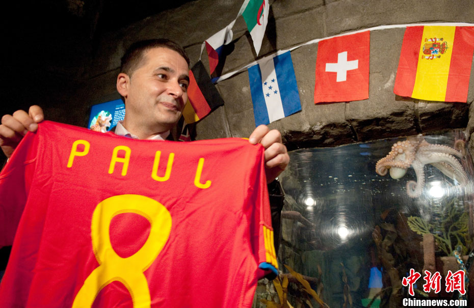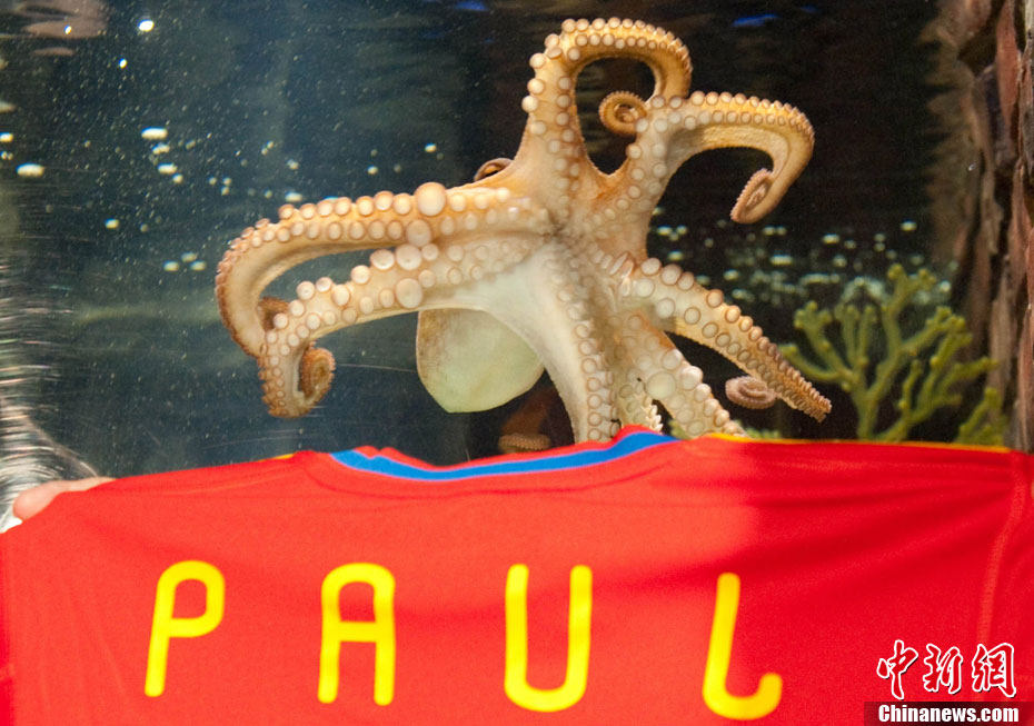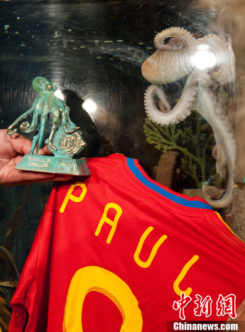 近日,曾在2010年南非世界杯上大放異彩的“章魚(yú)哥”保羅再獲殊榮。西班牙卡瓦利諾市市長(zhǎng)在德國(guó)奧博豪森水族館正式贈(zèng)送給保羅一件印有它名字的西班牙隊(duì)隊(duì)服和保羅自己的青銅像,稱(chēng)保羅為“城市最好的朋友”。