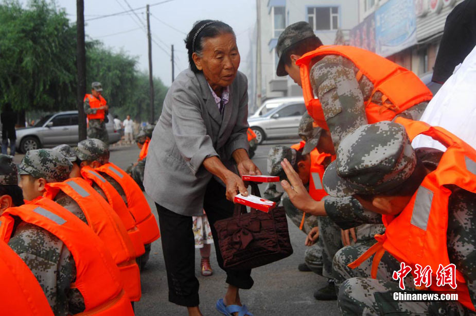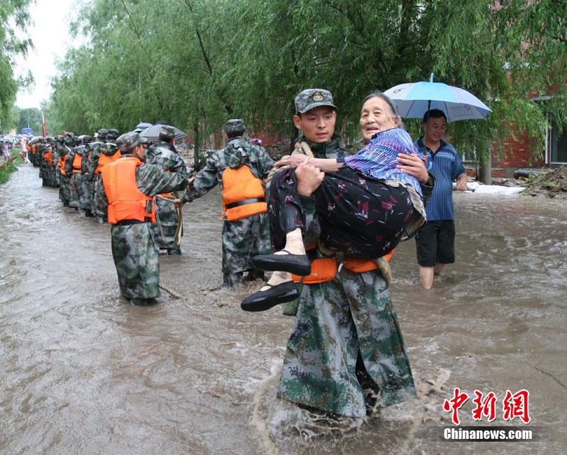 28日以來的一場暴雨讓吉林省多個地區(qū)遭遇罕見洪災(zāi),此后對災(zāi)區(qū)的救援緊張進行。目前在永吉縣口前鎮(zhèn),已有部分商戶恢復(fù)營業(yè)。圖為在重災(zāi)區(qū)永吉縣,士兵將一名老婦轉(zhuǎn)移到安全地帶。中新社記者 張杰 攝