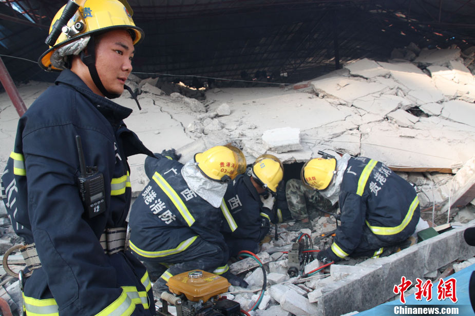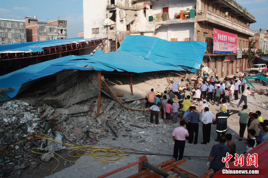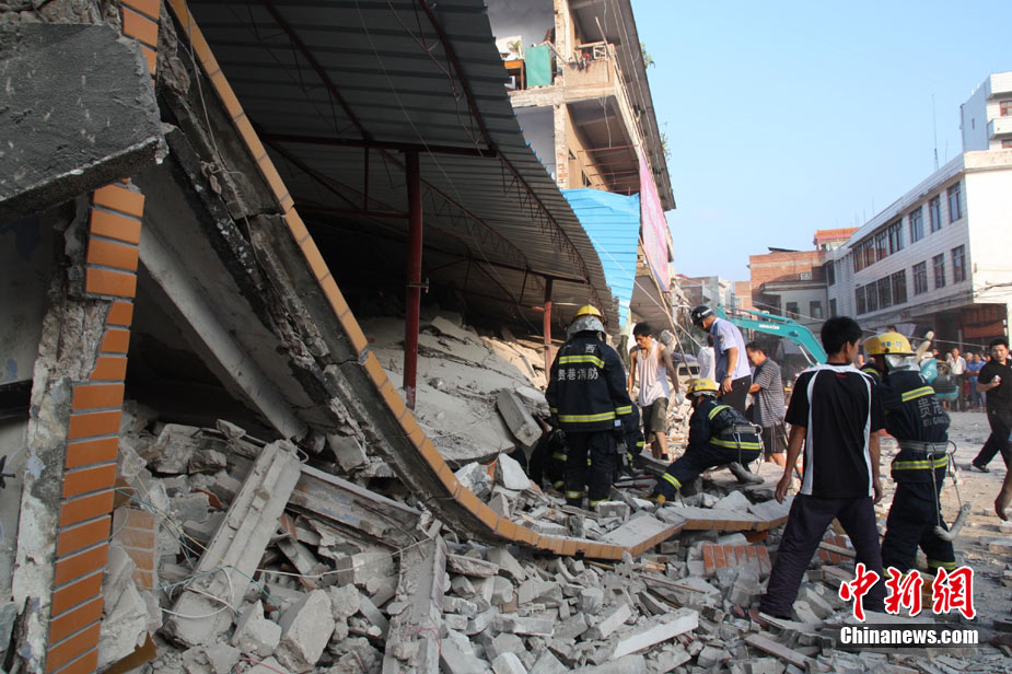 8月13日早晨,廣西貴港市橋圩鎮(zhèn)供銷社百貨門市部一棟3層的樓房突然倒塌,造成12名住戶被埋廢墟中。至上午10時(shí)50分,已知被埋人員被消防官兵全部救出,事故造成3人死亡9人受傷。中新社發(fā) 楊文福 攝