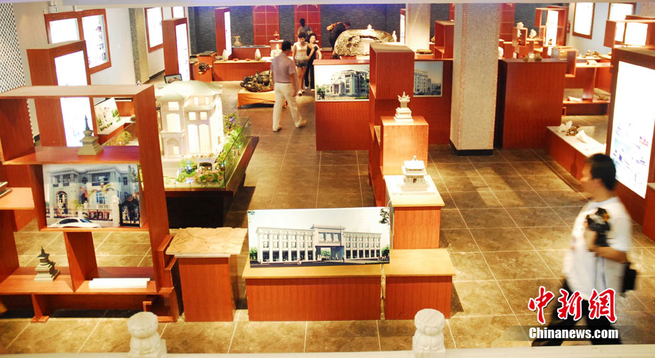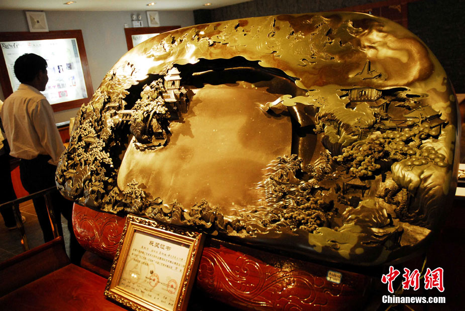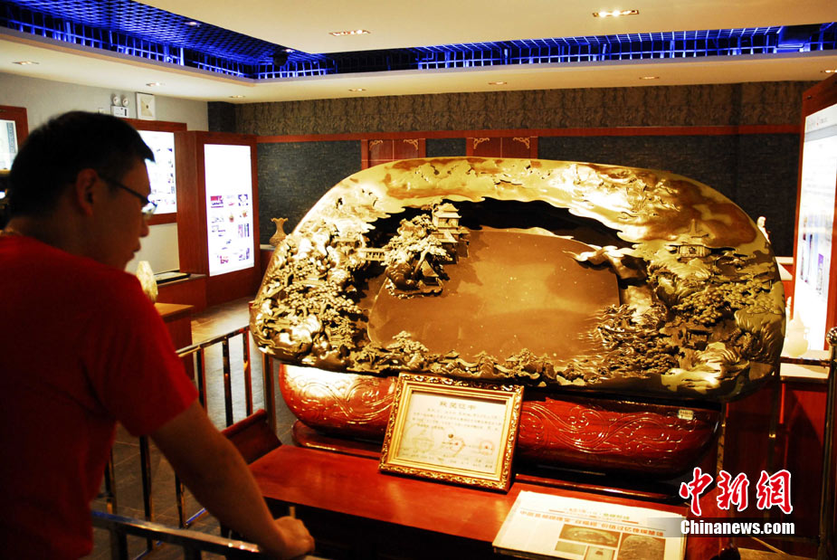 云南首個石文化體驗館日前在石林建成并對外開放。該館是集生產(chǎn)和銷售為一體,目的在于推廣石文化,展示石頭的魅力。圖為叫價8000萬的奇石硯臺成為該館鎮(zhèn)館石。中新社發(fā) 田洪 攝