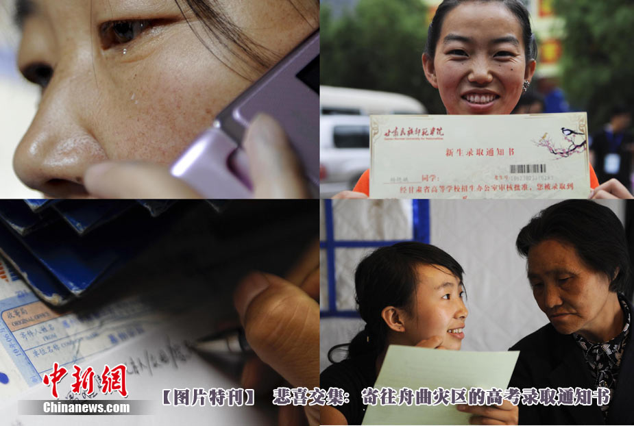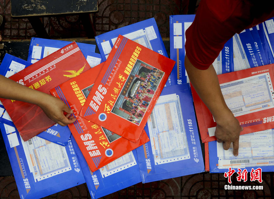 8月14日,甘肅舟曲災(zāi)區(qū)的高考錄取通知書正在發(fā)放過程中,學(xué)生們接過火紅色的錄取通知書信封,眼里有藏不住的笑意。然而,有一些通知書卻永遠(yuǎn)無(wú)法發(fā)出了。截至上午10點(diǎn)30分,舟曲一中收發(fā)室當(dāng)天共發(fā)出7份錄取通知書,還有30多封正等待領(lǐng)取。中新社發(fā) 廖攀 攝