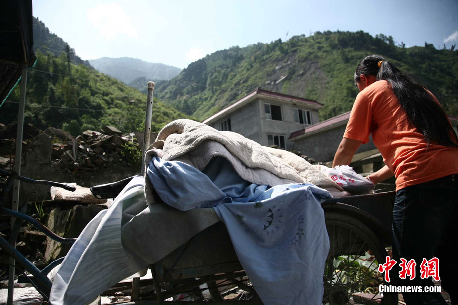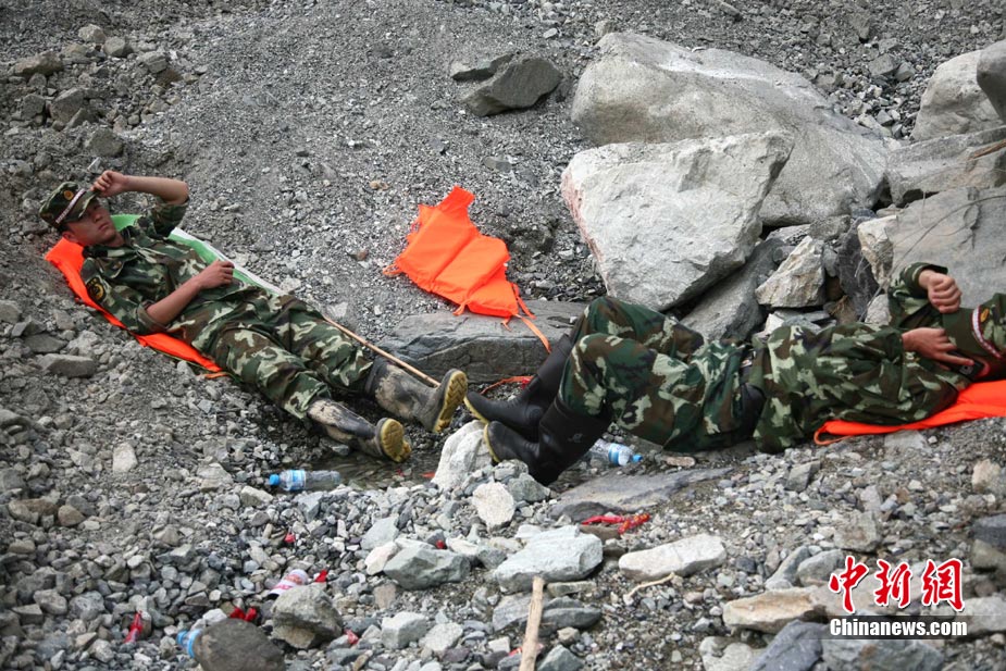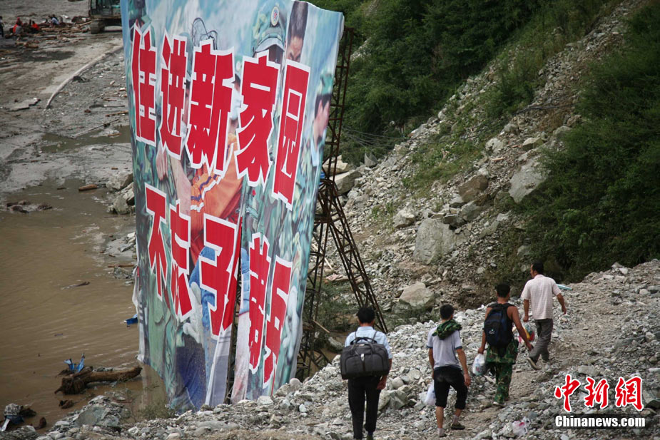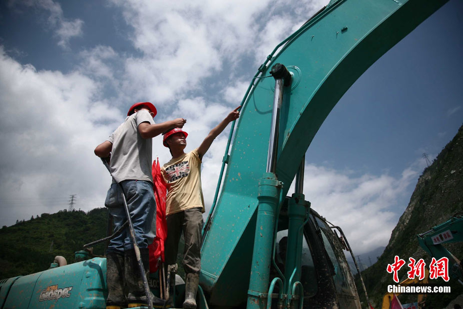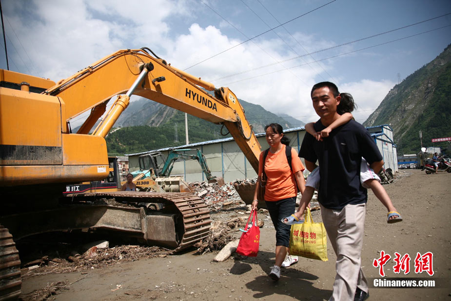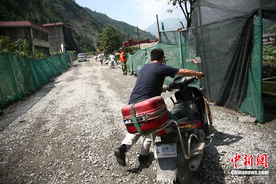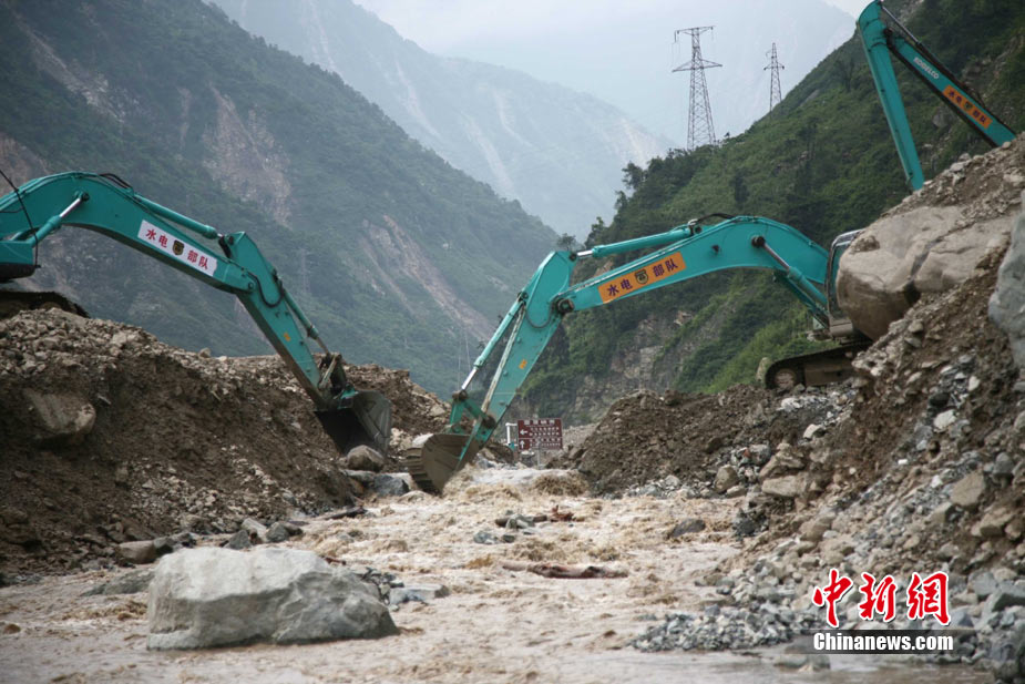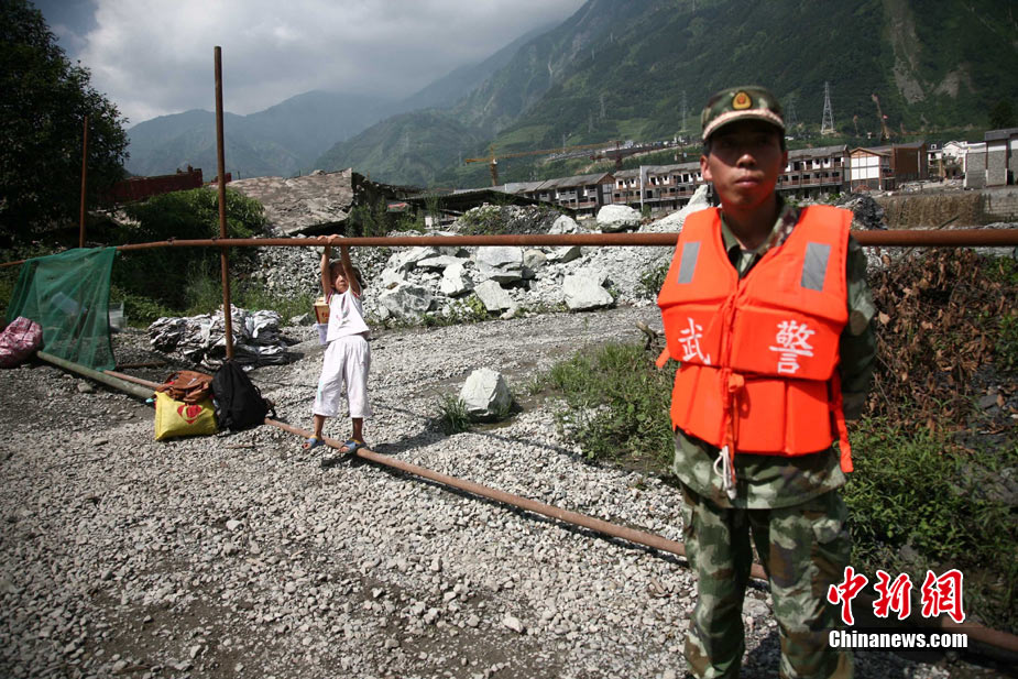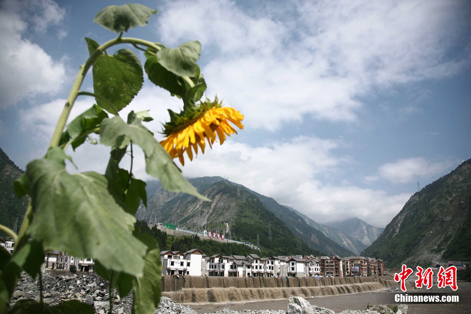 阿壩州汶川境內(nèi)因近日強(qiáng)降雨而引發(fā)的泥石流阻斷道路、沖毀房屋,泥石流沖出物致使120米寬的岷江河道淤塞,堰塞體平均高度達(dá)7米,致使岷江改道。災(zāi)后重建的映秀新城亦被洪水圍困再次成為“孤島”。8月15日,映秀天空放晴,但堰塞體還未得到根本疏通,映秀新城仍被淹水中,現(xiàn)場(chǎng)搶險(xiǎn)指揮人員表示,堰塞體有望15日下午得到疏通。圖為映秀鎮(zhèn)岷江河床上一朵快枯萎的向日葵,背后則是被水淹的重建新房。 中新社發(fā) 張浪 攝