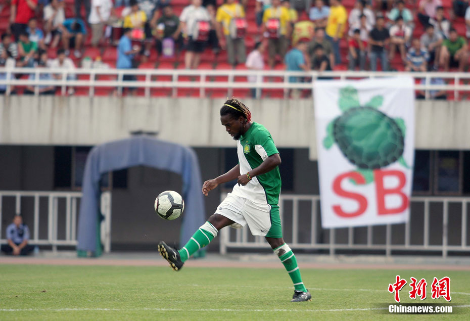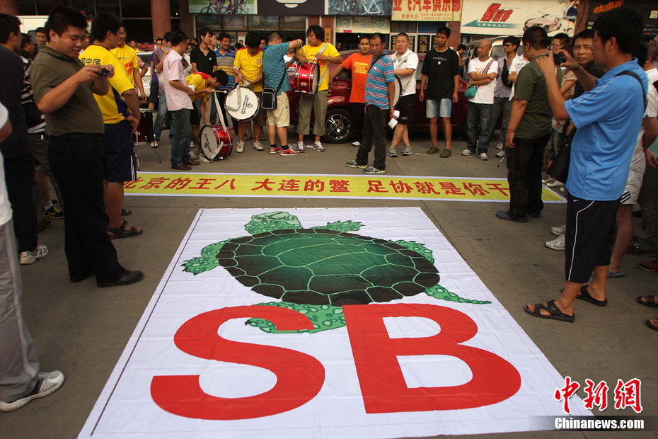 2010年8月17日,西安,北京國安隊在陜西省體育場備戰(zhàn)中超聯(lián)賽第19輪和陜西隊的客場比賽。陜西球迷“組團”來到現(xiàn)場,用持續(xù)不斷的罵聲干擾國安隊戰(zhàn)前的踩場訓練,球迷們還打出了“綠烏龜”的畫幅和各種標語暗諷國安。中新社發(fā) 梁萌 攝 圖片來源:CNSPHOTO
