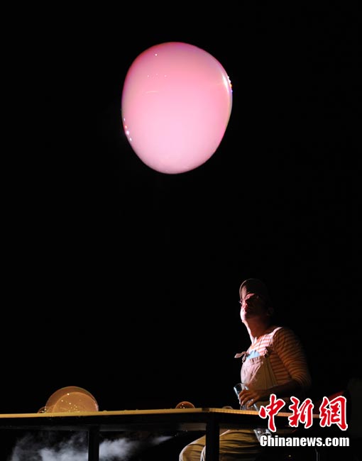 當(dāng)?shù)貢r(shí)間8月18日,西班牙馬德里,藝術(shù)家 Luis Bevia在舞臺(tái)上大!胺试砼菽g(shù)”。