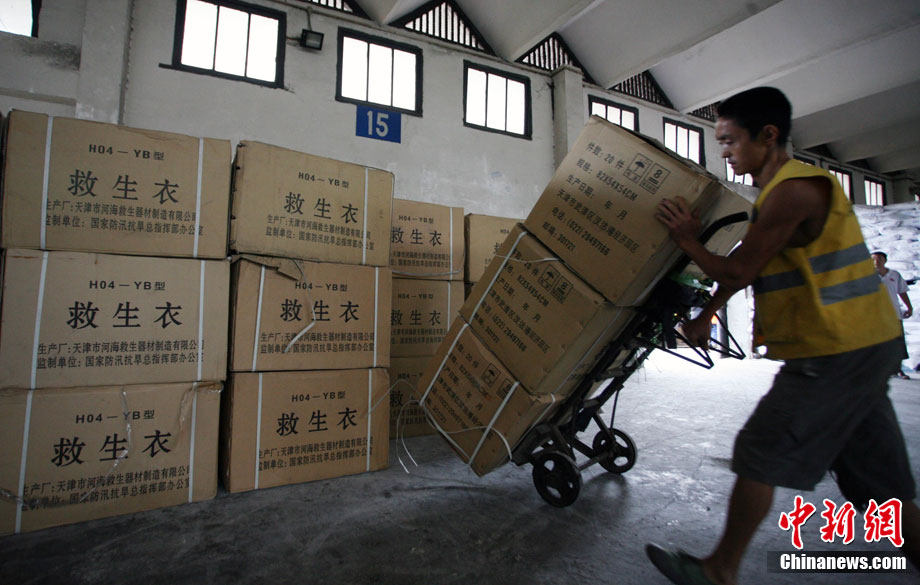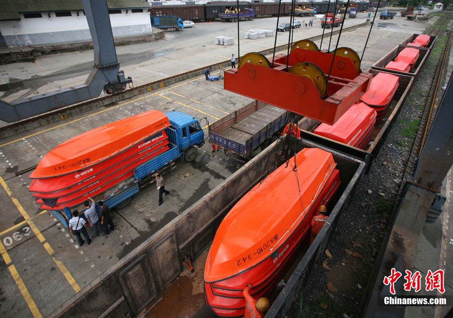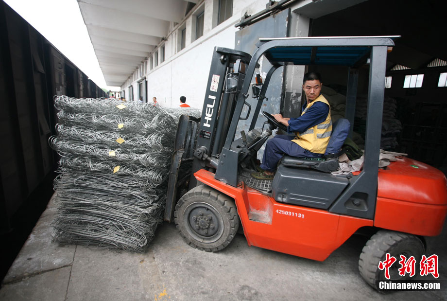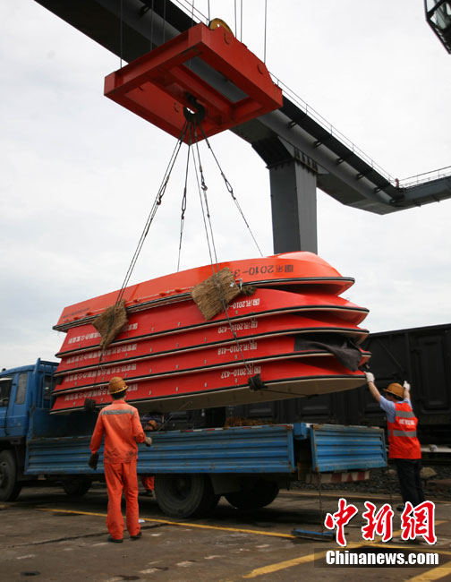 8月21日上午,國家防總緊急調(diào)撥的80艘沖鋒舟,40支橡皮舟、120臺船外機、1萬件救生衣、4000片鉛絲籠網(wǎng)片、4000個鋼絲網(wǎng)兜、500盞查險燈等搶險救災物資順利抵達成都火車東站,將立刻分發(fā)運往成都、眉山、樂山、巴中等災情嚴重地區(qū)。圖為裝卸工人正在吊裝沖鋒舟。中新社發(fā) 劉忠俊 攝