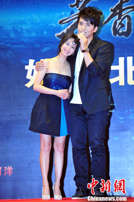 8月25日,電影《芳香之城傳奇》在北京舉行記者會。不老的“紫霞仙子”朱茵攜主演扎西頓珠、張達明、李子雄、張璇、董立范等亮相。朱茵以一襲抹胸短裙亮相,自曝在新片中大轉型,飾演一個有天然體香的神秘啞女,男主角扎西頓珠飾演的“富二代”被其吸引后,上演了一段純美姐弟戀。朱茵在接受采訪時坦言自己并不拒絕姐弟戀。圖為朱茵、扎西頓珠現(xiàn)場秀親昵。中新社記者 李學仕 攝