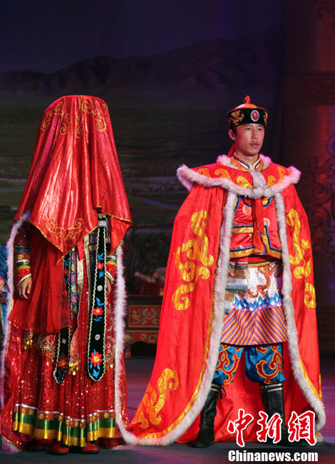 8月25日晚,參加“鄂爾多斯青銅器與早期東西方文化交流——北方草原通道”國(guó)際學(xué)術(shù)研討會(huì)的近百位中外考古學(xué)家,觀賞蒙古族傳統(tǒng)婚禮。圖為英國(guó)劍橋大學(xué)馬丁·瓊斯教授(右)、倫敦大學(xué)大衛(wèi)·哈里斯教授擔(dān)任婚禮主婚人,并應(yīng)邀掀開(kāi)新娘子的紅蓋頭。中新社記者 孫自法 攝
