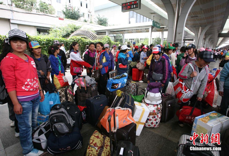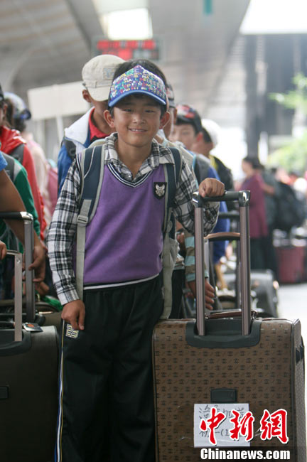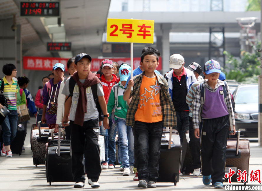 9月6日中午,青海省玉樹州地震災(zāi)區(qū)民族中學(xué)2013級(jí)初一、高一486名新生經(jīng)過長(zhǎng)途跋涉安全抵達(dá)成都,他們將在四川都江堰八一聚源中學(xué)異地過渡。至此,玉樹州民族中學(xué)成建制轉(zhuǎn)移安置工作全部結(jié)束。圖為玉樹州民族中學(xué)新生抵達(dá)成都火車站。 中新社發(fā) 劉忠俊 攝