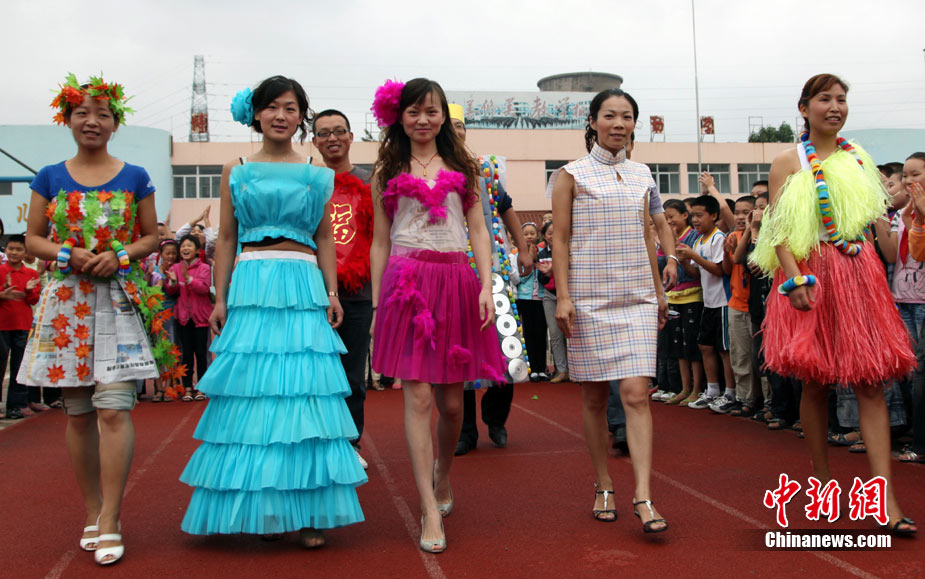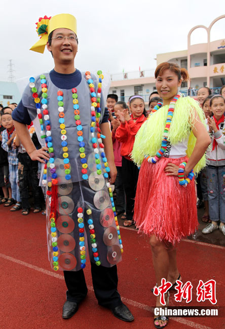 9月8日,山東省棗莊市市中區(qū)中興小學(xué)教師用舊報(bào)紙、光盤(pán)等廢舊物品制作的環(huán)!皶r(shí)裝”,向?qū)W生們進(jìn)行展示。他們用實(shí)際行動(dòng)引導(dǎo)學(xué)生養(yǎng)成低碳生活的良好習(xí)慣,喜迎教師節(jié)到來(lái)。中新社發(fā) 吉 喆 攝 圖片來(lái)源:CNSPHOTO
