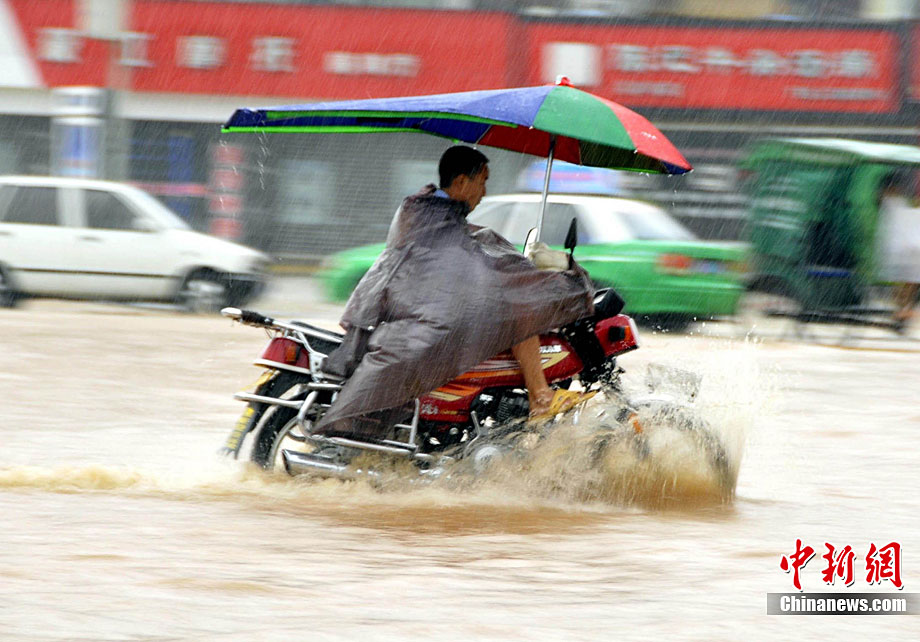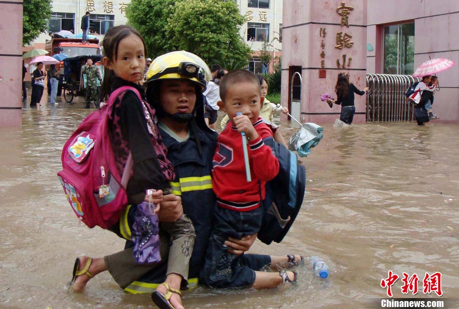 9月9日,四川省南充市突降暴雨,造成該市的高坪、嘉陵、順慶等主城區(qū)部分低洼地帶積水嚴(yán)重。高坪區(qū)第八小學(xué)、第六小學(xué),嘉陵區(qū)光彩實(shí)驗(yàn)小學(xué)被洪水圍困,南充消防官兵緊急出動(dòng),及時(shí)將被洪水圍困900多名小學(xué)生轉(zhuǎn)移至安全地帶。圖為消防、老師正在轉(zhuǎn)移受困學(xué)生。中新社發(fā) 南消萱 攝