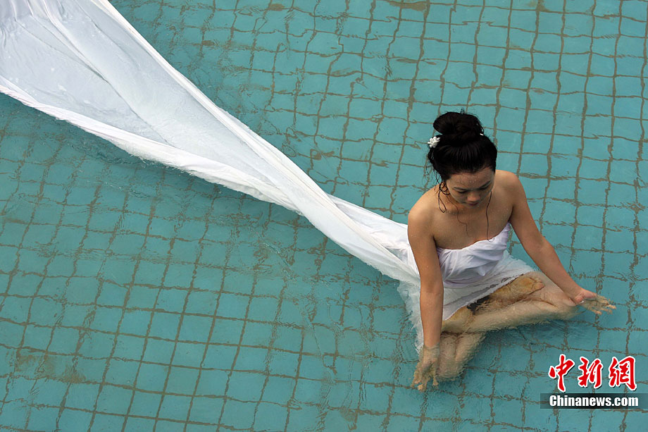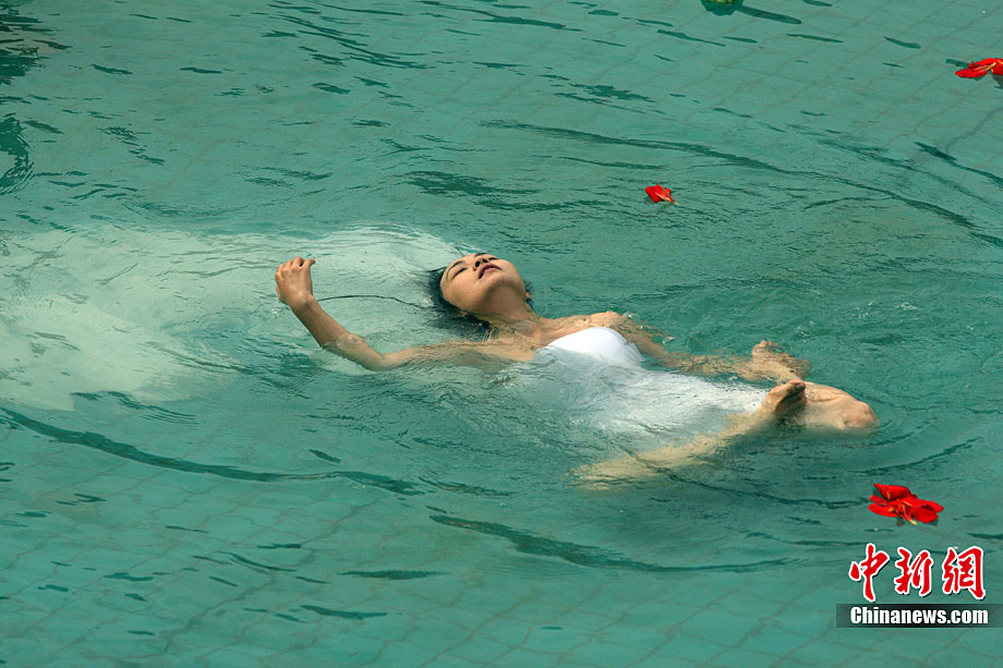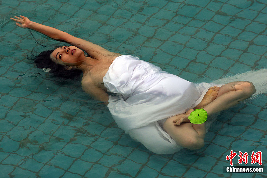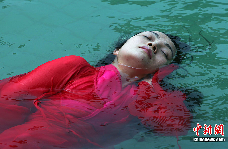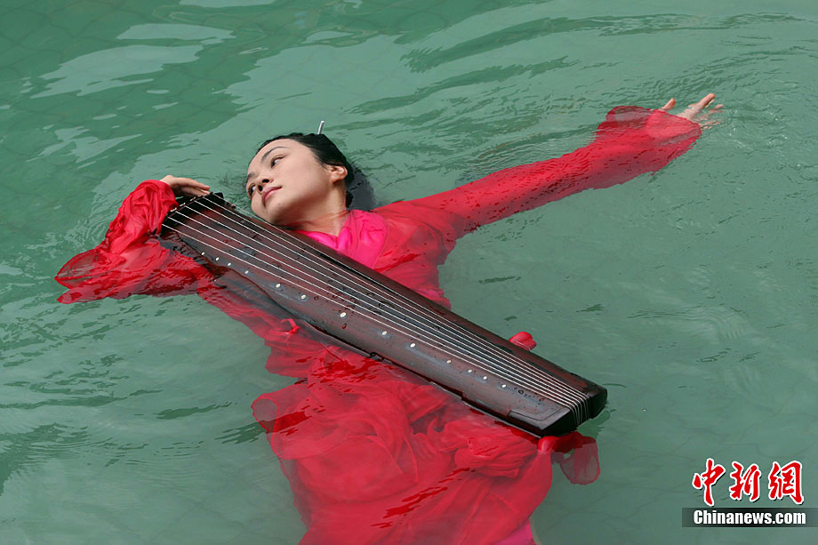9月11日,漂浮于水上時而禪坐、時而圍繞水中漂浮的古琴緩緩起舞,伴著古琴樂,池水不時變換出各種造型的“水墨畫”,一種前沿新藝術形式在湖北咸寧太乙洞溫泉上演。原創(chuàng)及表演者彭子軒,提出藝術養(yǎng)生的理念,并獨創(chuàng)以子軒內練為基礎的藝術漂浮(包含藝術漂浮舞蹈及藝術漂浮瑜伽),被譽為中國古典花樣游泳。毛建軍 攝