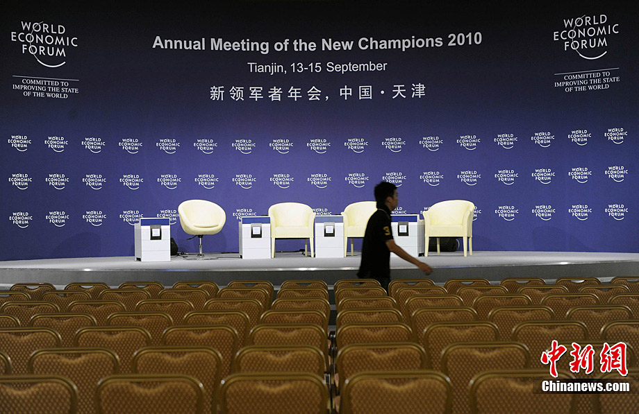 9月12日,2010夏季達(dá)沃斯各項(xiàng)籌備就緒,靜待明日開幕。近90個(gè)國(guó)家的超過(guò)1500名代表云集天津,將圍繞“推動(dòng)可持續(xù)增長(zhǎng)”這一主題展示各自真知灼見。中新社記者 劉震 攝