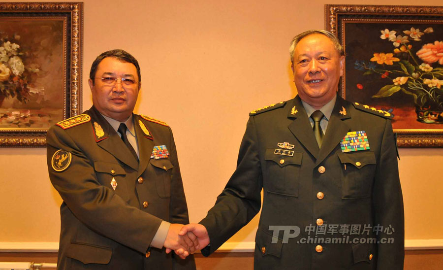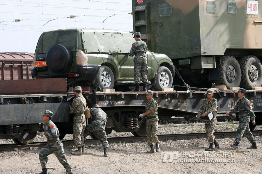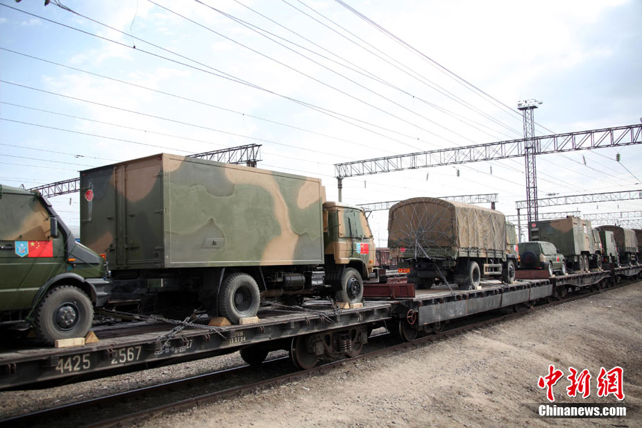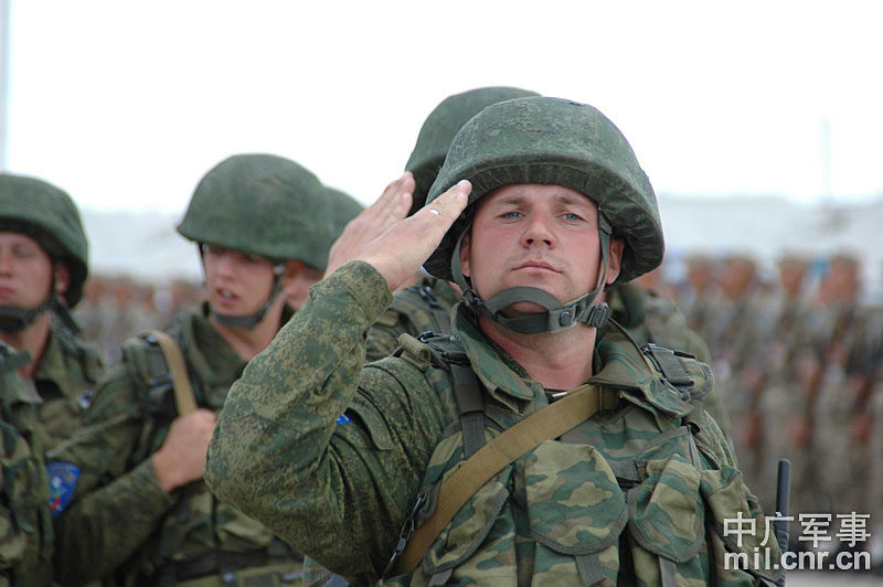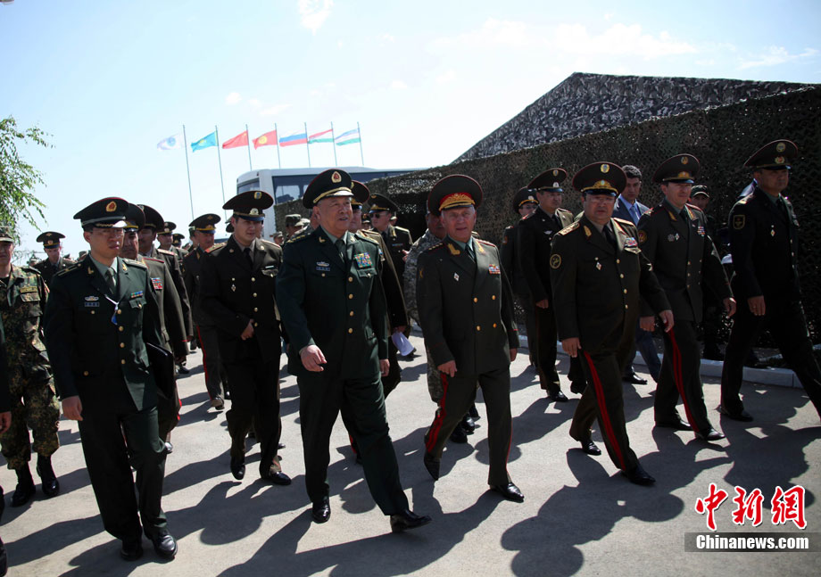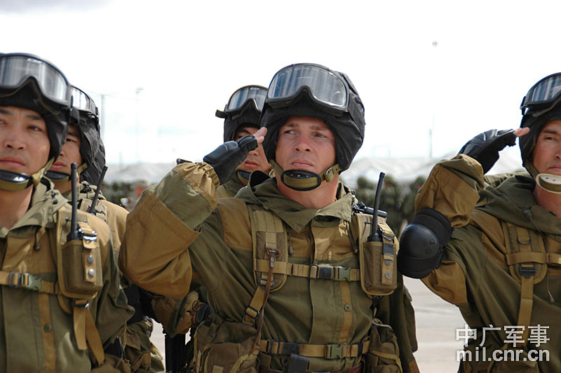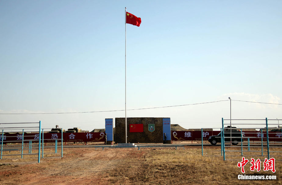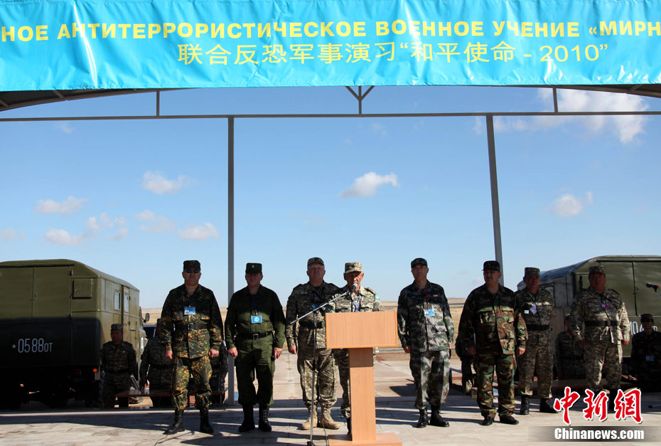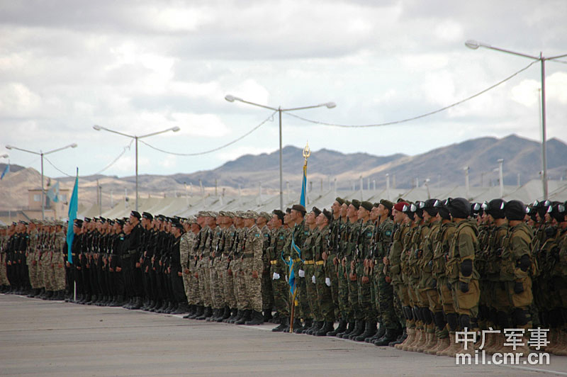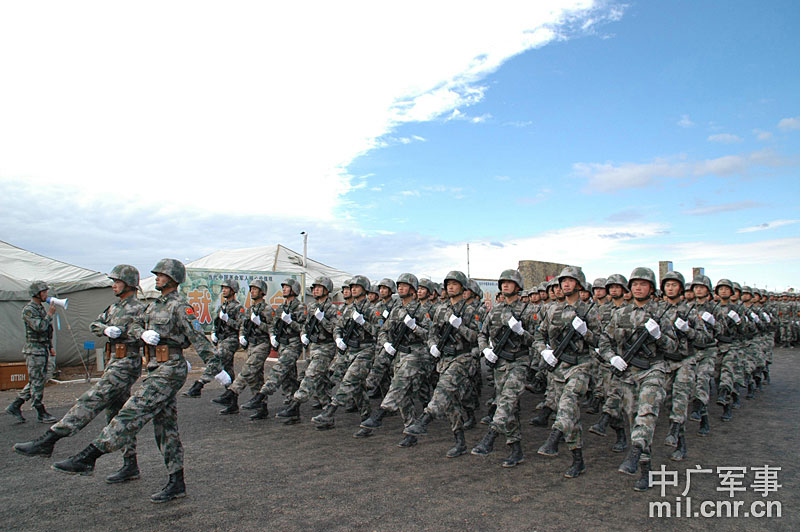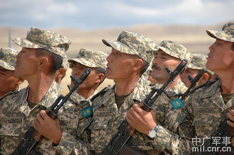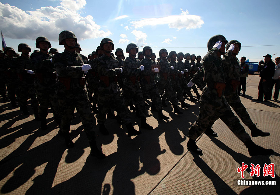 9月13日,“和平使命-2010”上海合作組織聯(lián)合反恐軍事演習(xí)在哈薩克斯坦馬特布拉克訓(xùn)練場舉行盛大的開訓(xùn)儀式,標(biāo)志著這次聯(lián)合軍演由戰(zhàn)役磋商階段正式轉(zhuǎn)入戰(zhàn)役準(zhǔn)備階段。隨后,哈、中、吉、俄、塔五方參演部隊(duì)依次舉行分列式,圖為中方參演部隊(duì)邁著矯健的步伐從開訓(xùn)儀式主席臺前列隊(duì)走過,接受檢閱。中新社記者 孫自法 攝
