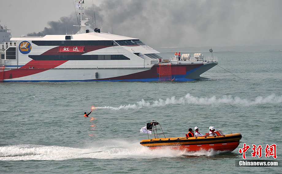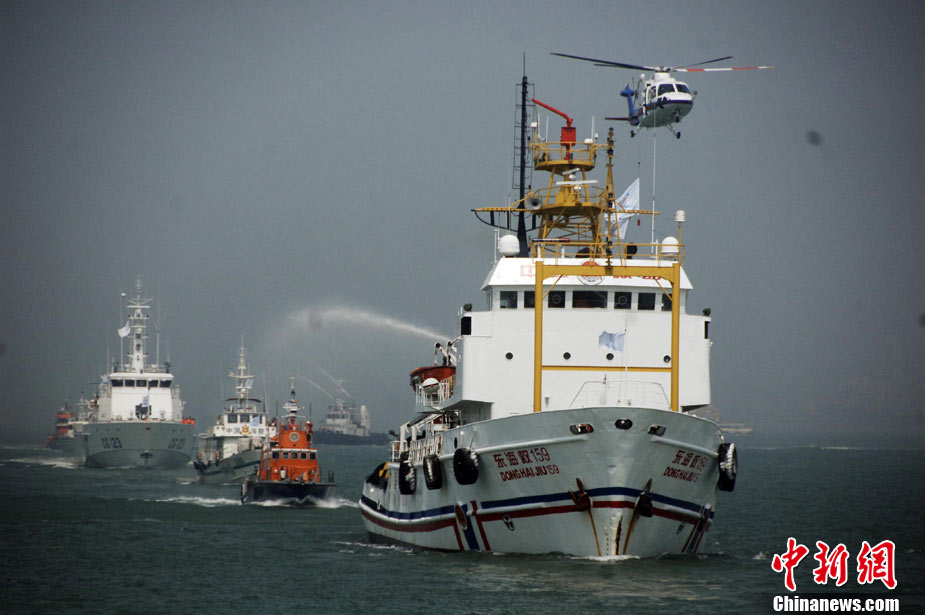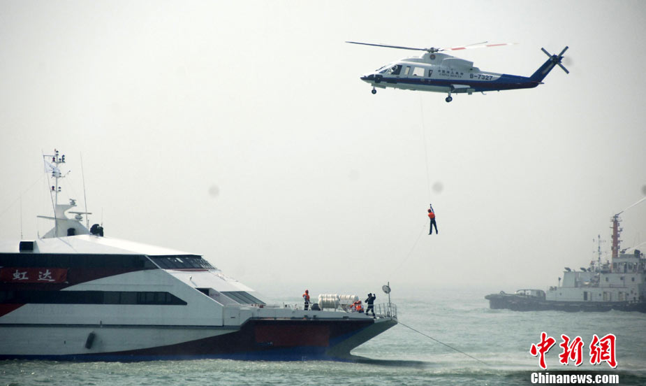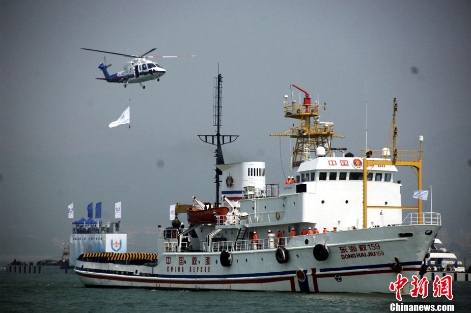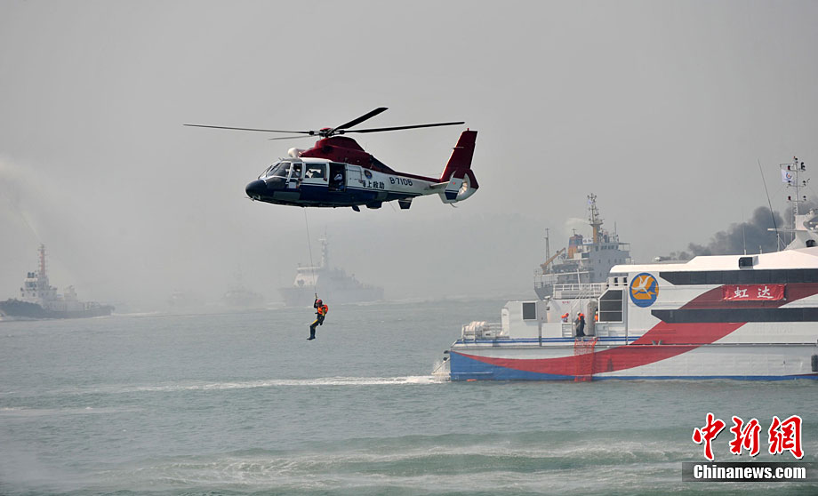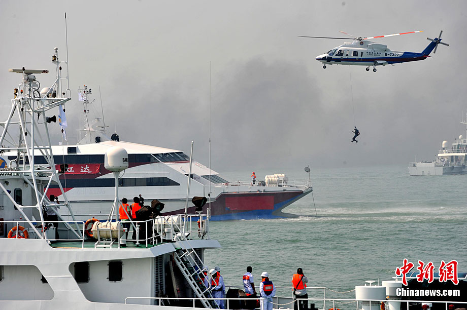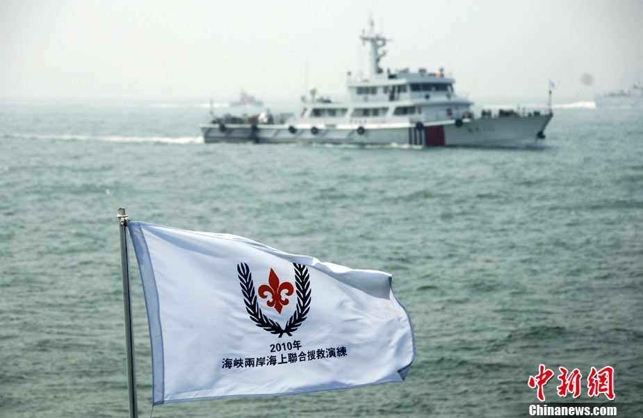 9月16日上午,2010年海峽兩岸海上聯(lián)合搜救演練在臺(tái)灣海峽的廈門(mén)、金門(mén)附近海域舉行。海峽兩岸海上搜救單位參演人數(shù)400多人,共動(dòng)用搜救船舶14艘、救助飛機(jī)3架。其中大陸方面主要參演船舶9艘、救助直升機(jī)2架;臺(tái)灣方面主要參演船舶5艘、救助直升機(jī)1架。這是自2008年12月15日兩岸海上直航正式啟動(dòng)以來(lái),海峽兩岸海上搜救力量首次共同進(jìn)行的大規(guī)模海陸空聯(lián)合搜救演練。圖為演練現(xiàn)場(chǎng)。中新社發(fā) 王東明 攝
