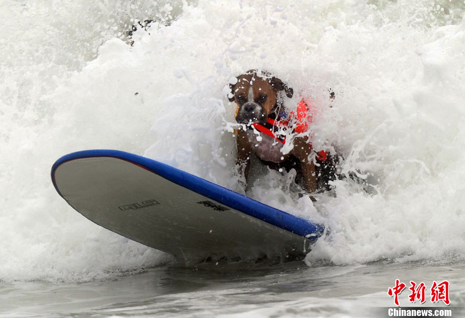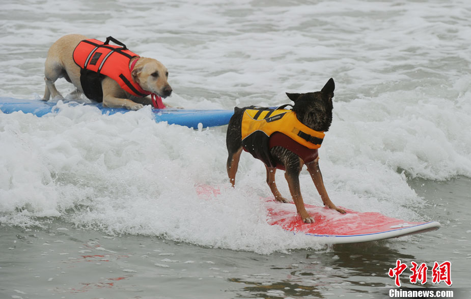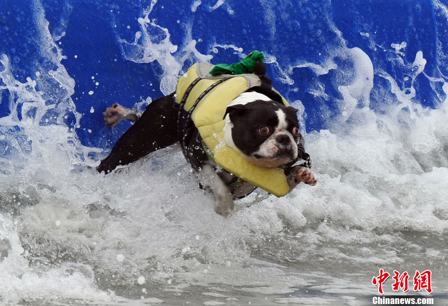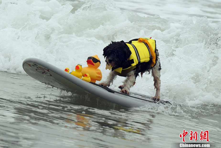 9月19日,在美國(guó)加利福尼亞州的亨廷頓比奇,可愛的狗狗們舉行了一場(chǎng)別開生面的沖浪大賽。