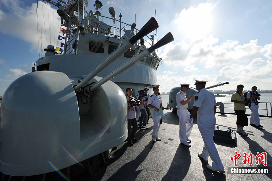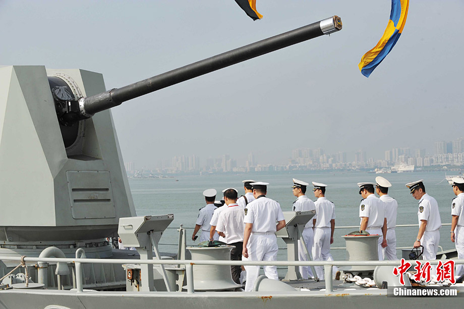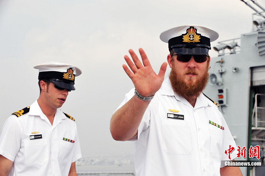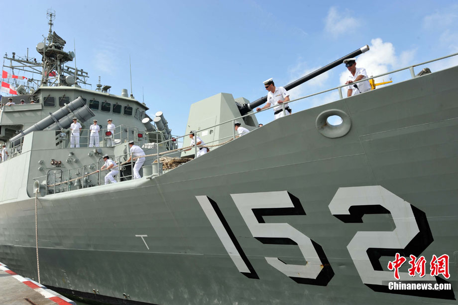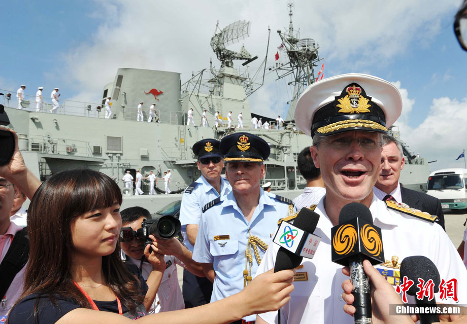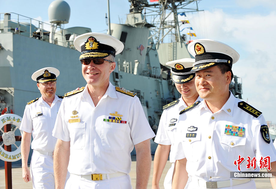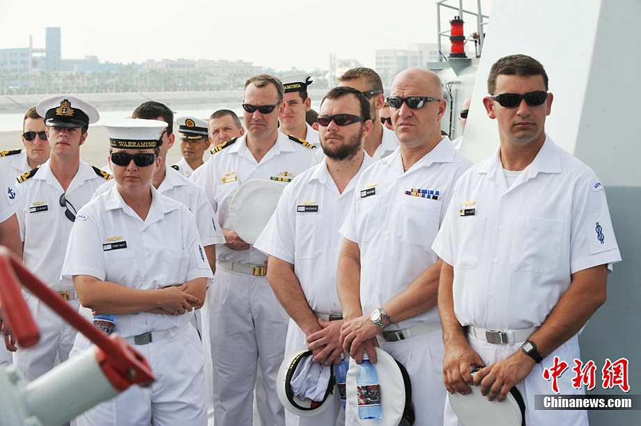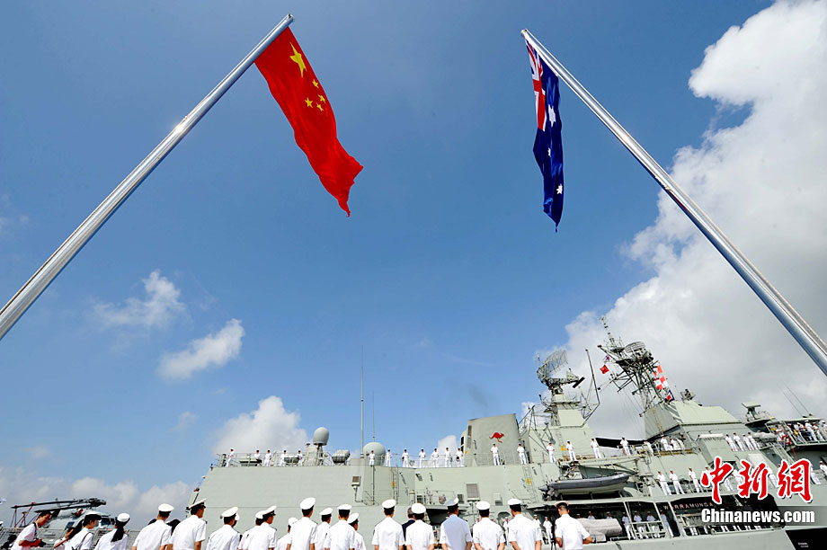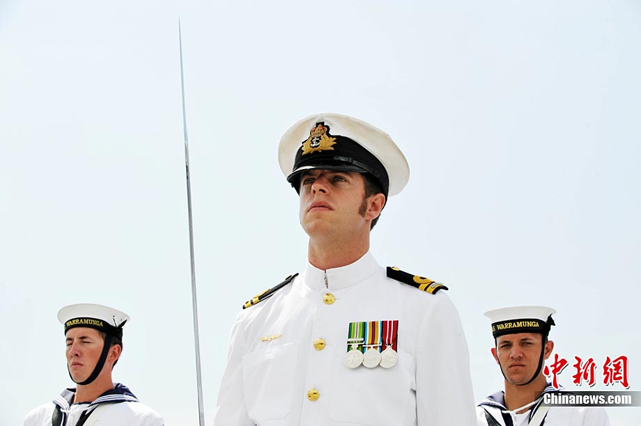 9月26日,應(yīng)中國(guó)人民解放軍海軍邀請(qǐng),澳大利亞海軍艦隊(duì)司令吉爾摩少將率海軍“瓦拉蒙加”號(hào)護(hù)衛(wèi)艦抵達(dá)湛江某軍港進(jìn)行友好訪問(wèn),南海艦隊(duì)舉行了隆重的歡迎儀式。中新社記者 陳文 攝