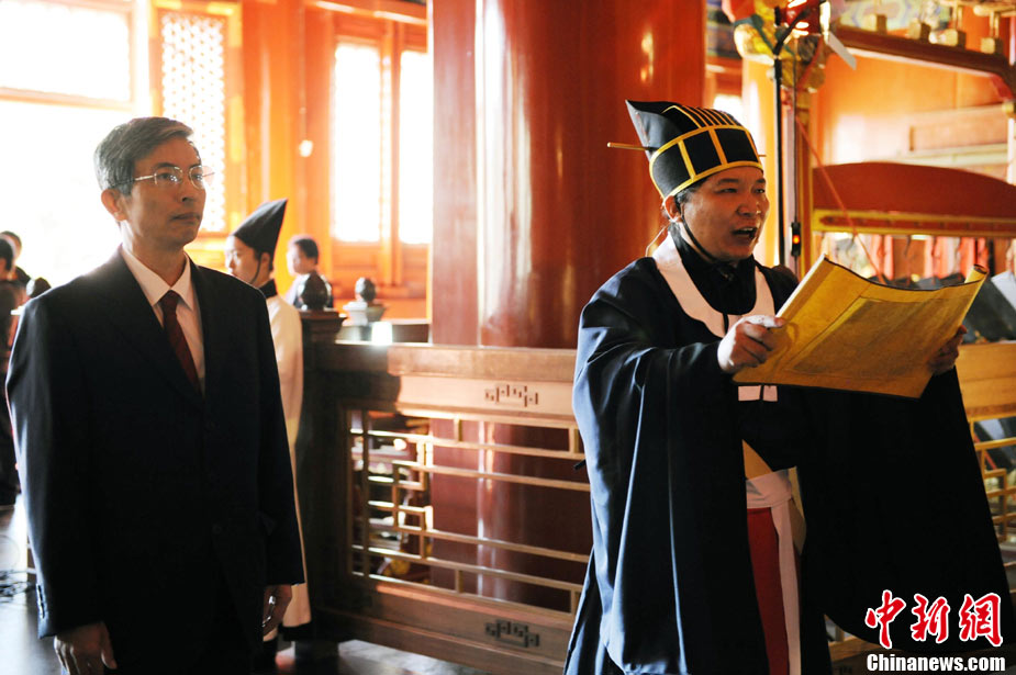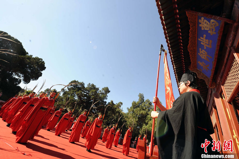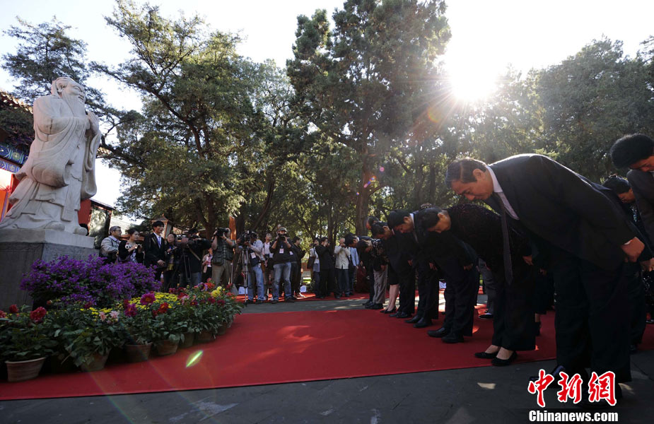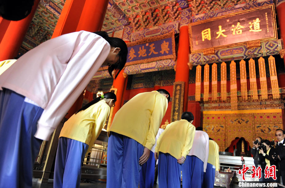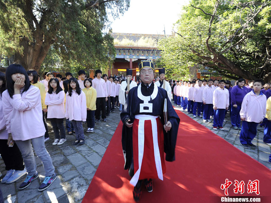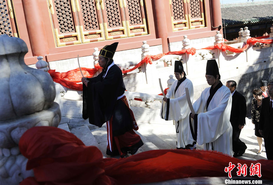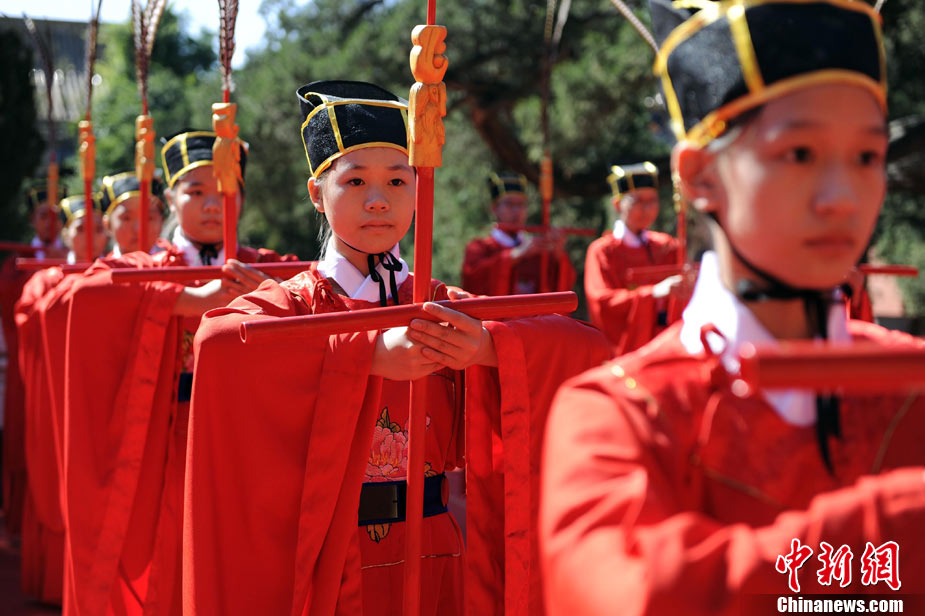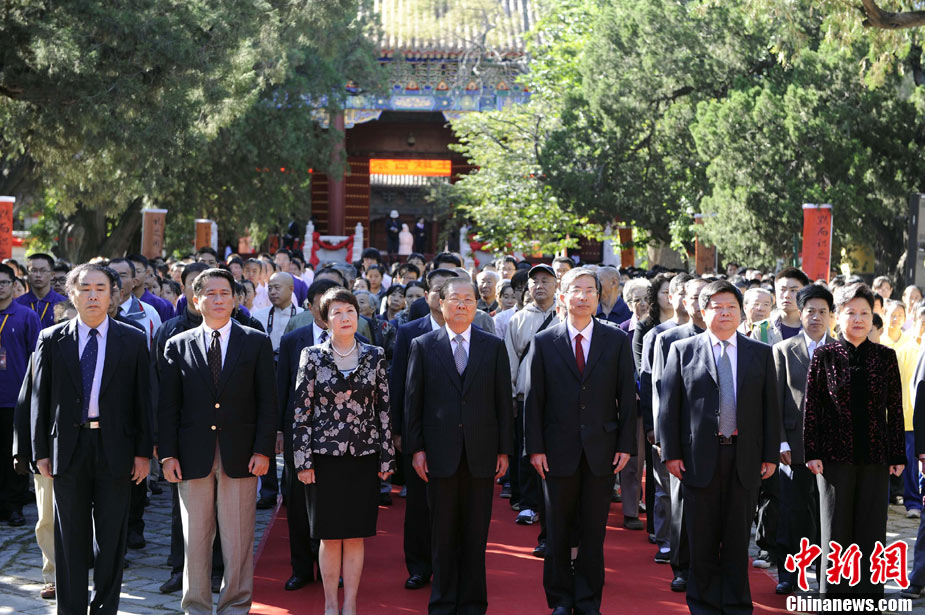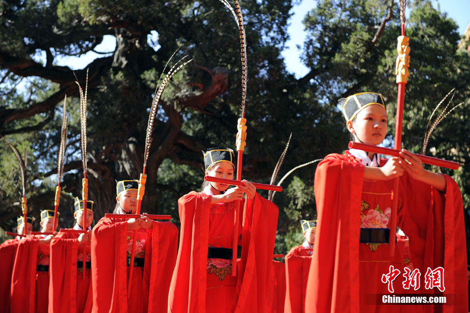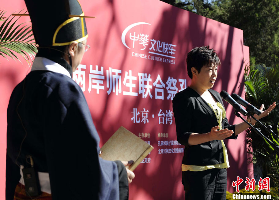 9月28日上午,兩岸師生聯(lián)合祭孔大典儀式在北京孔廟舉行。來自臺灣和北京的兩岸師生共計500人,共同祭奠孔子,弘揚中華傳統(tǒng)文化。中新社記者 劉震 攝