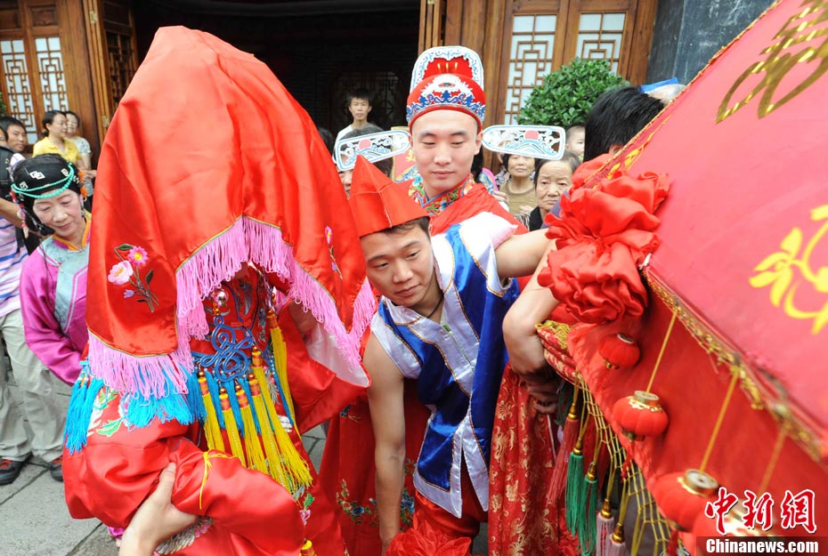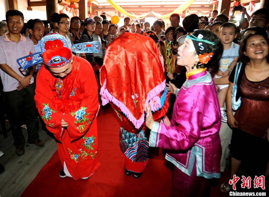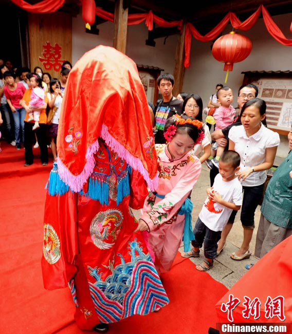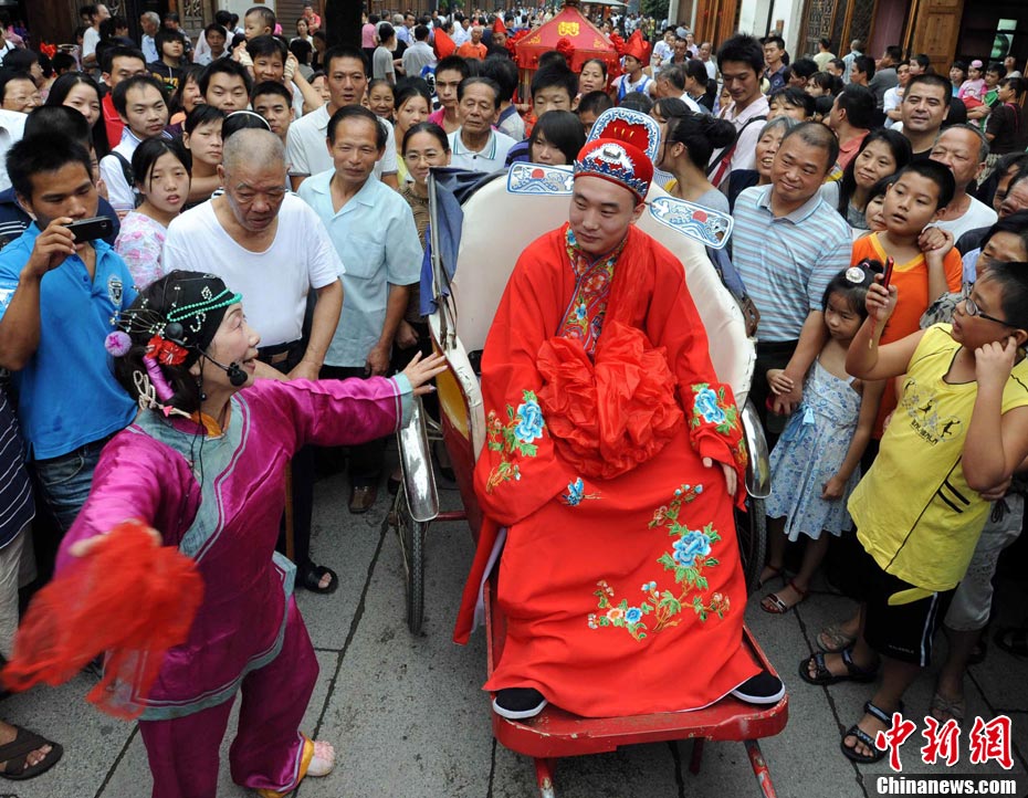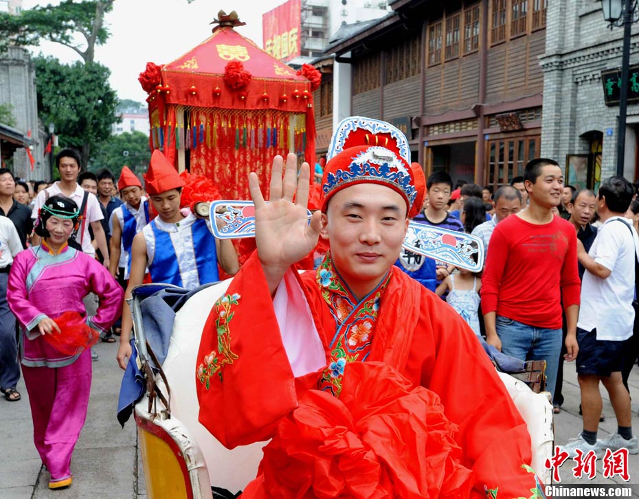 10月1日國慶節(jié),福州古街上演一場傳統民俗婚禮令眾多游客爭睹。該傳統民俗婚禮分起轎、回車馬、迎轎、下轎、祭拜天地、入洞房等場面喜慶。