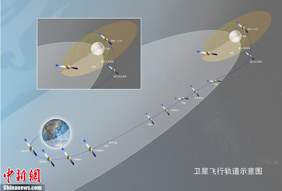 繼嫦娥一號衛(wèi)星圓滿完成我國首次繞月探測工程之后,嫦娥二號繞月探測衛(wèi)星作為我國探月工程二期的先行者,又踏上了奔月的征程。嫦娥二號軌道圖。圖片來源:中國航天科技集團公司