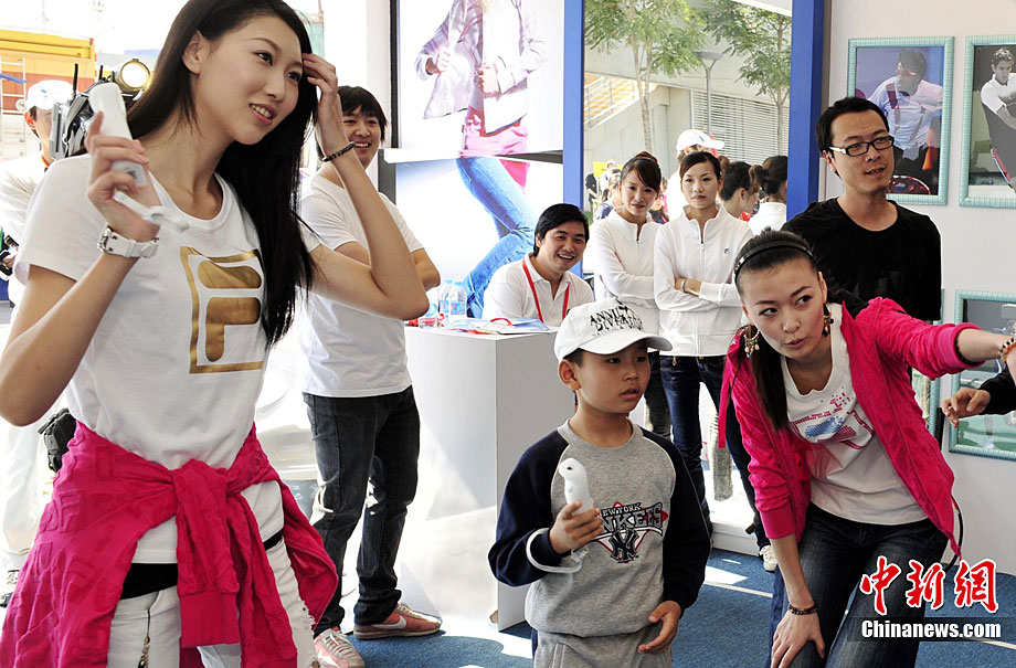 10月4日,時尚中網(wǎng)代言人、第五屆中國職業(yè)模特大賽冠軍趙晨池,首屆亞洲超級模特大賽冠軍王慧在北京亮相時尚運(yùn)動品牌FILA展臺,與現(xiàn)場的球迷朋友們開展了一場別開生面的網(wǎng)球游戲體驗(yàn)活動,助陣FILA及參與本屆中網(wǎng)的FILA四位代言人。中新社記者 錢興強(qiáng) 攝
