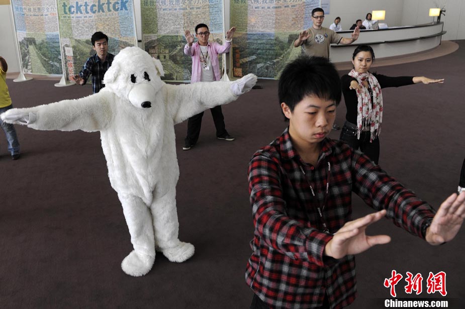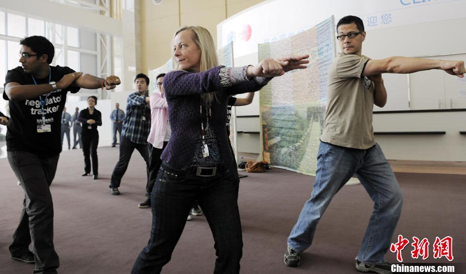 10月6日,聯(lián)合國氣候變化國際談判天津會議繼續(xù)舉行。全球氣候行動聯(lián)盟(TckTckTck 運動)特意安排了一個“北極熊”打太極的活動,邀請各國代表進入會場之前加入打太極拳。希望這兩天談判各方達成一個 “balanced package"(顧及各方利益的均衡協(xié)議),并以此警示人們愛護環(huán)境,拯救地球氣候。該組織由200個來自中國以及世界其他國家民間組織組成。 中新社記者 劉震 攝