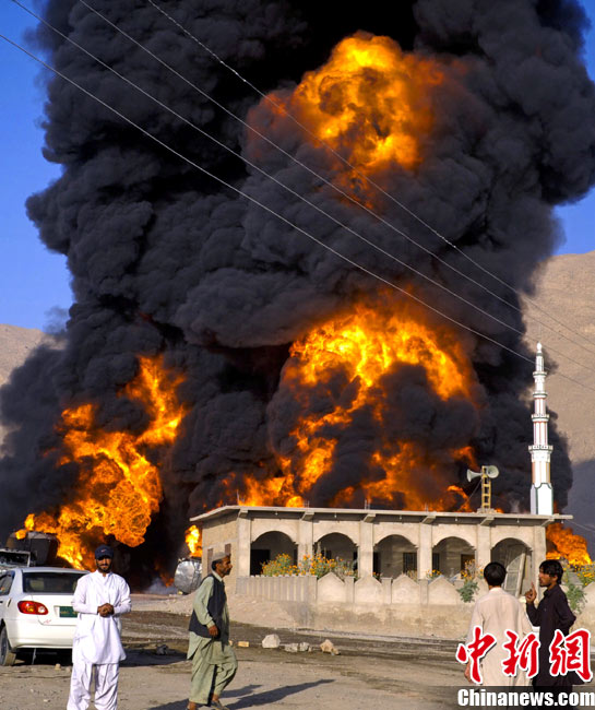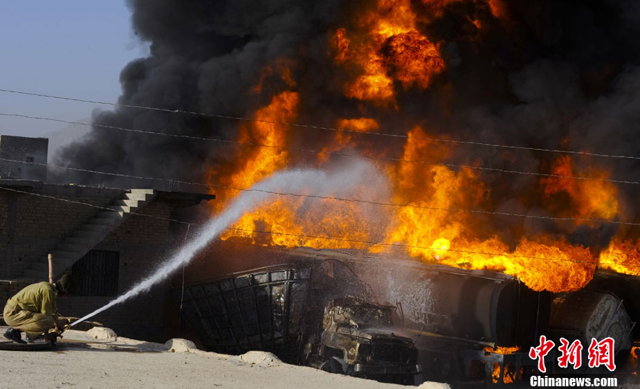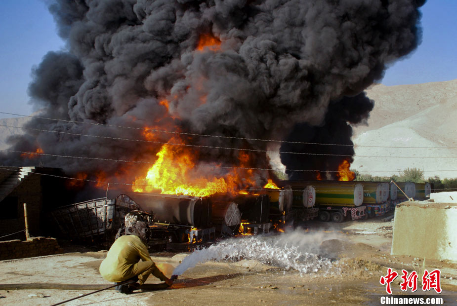 10月6日早晨,20多輛北約油罐車在巴基斯坦西部城市奎達(dá)附近被一伙身份不明的武裝分子燒毀,警方稱可能有人員傷亡。據(jù)報(bào)道稱,火勢非常猛烈,從距離很遠(yuǎn)的地方都能看到。消防隊(duì)員正在實(shí)施緊急滅火作業(yè)。