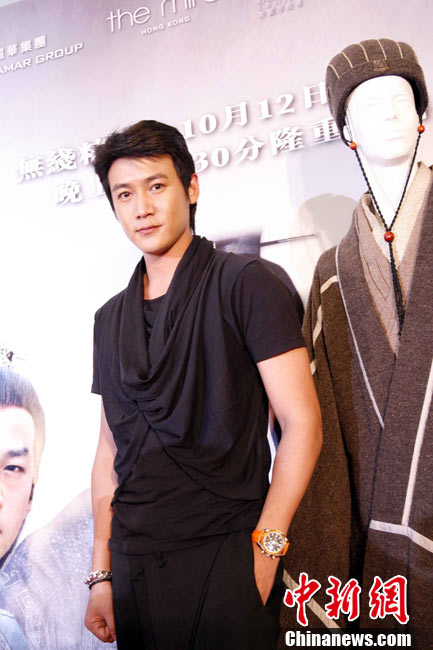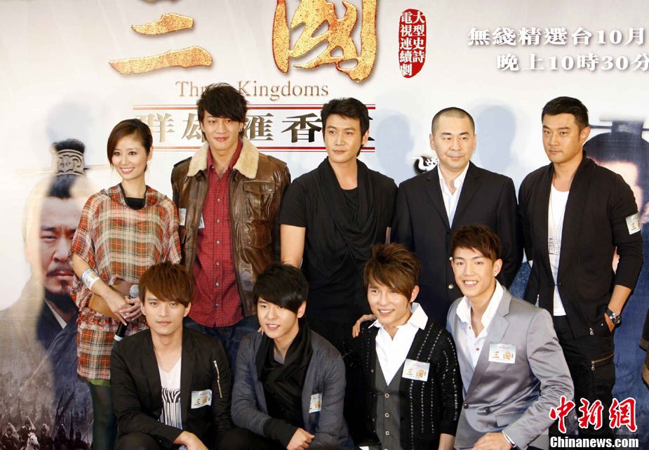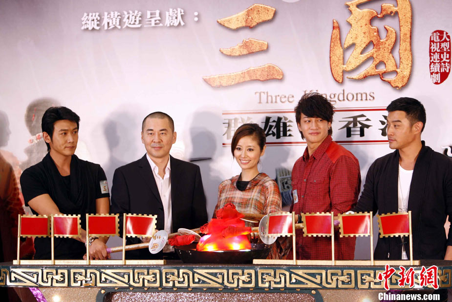 耗資過億元,籌備長達(dá)5年,云集內(nèi)地、香港、臺灣著名演員傾力演出的《三國》歷史劇,將在香港開播。10月9日,該劇主角演員(左起)陸毅、陳建斌、林心如、何潤東及黃維德匯集香港,登臺主持《烽火英雄會(huì)儀式》勢掀《三國》劇熱潮。中新社發(fā) 洪少葵 攝