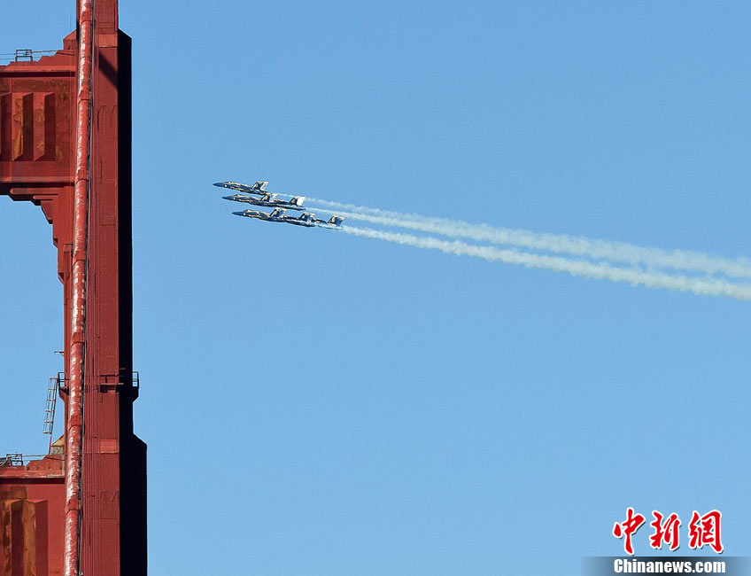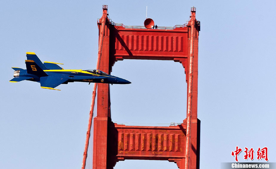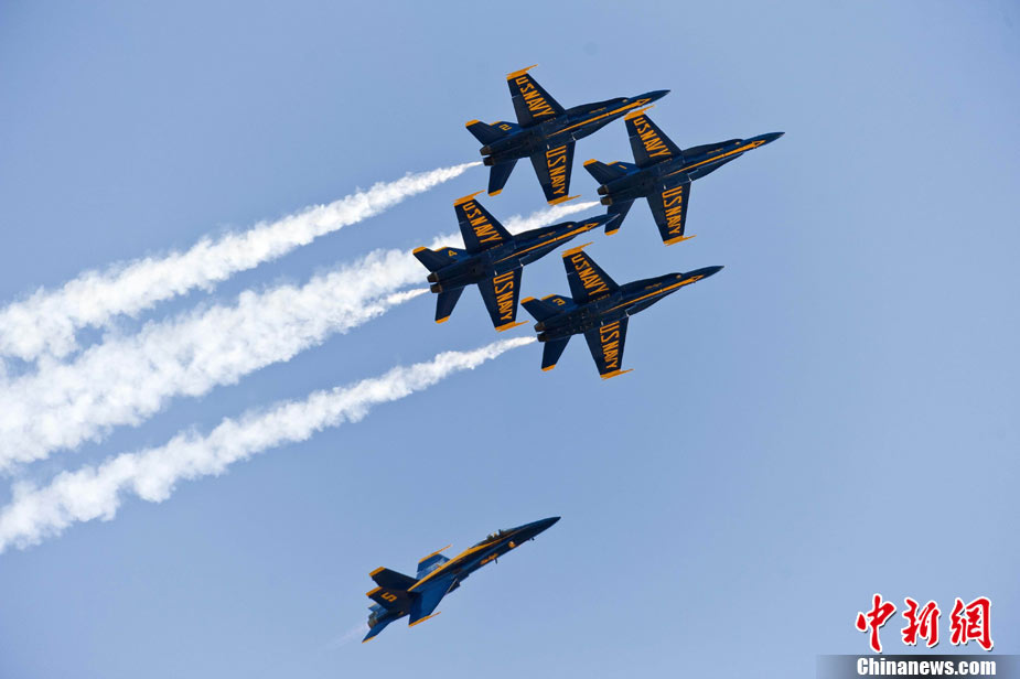 當(dāng)?shù)貢r間10月9日下午,美國海軍藍(lán)天使飛行表演隊(duì)在舊金山舉行一年一度的“艦隊(duì)周”活動。圖為5架F-18戰(zhàn)斗機(jī)編隊(duì)表演。 中新社發(fā) 陳鋼 攝