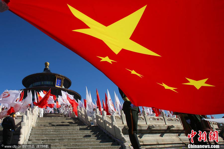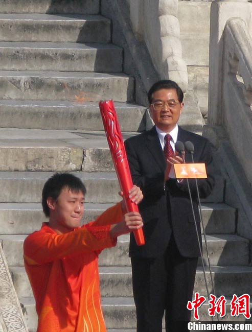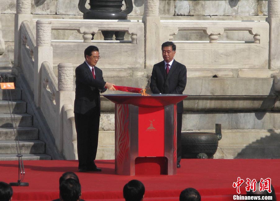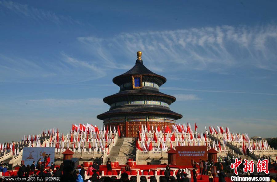 10月12日上午,廣州亞運(yùn)會火炬點(diǎn)燃暨傳遞啟動儀式在北京天壇祈年殿南廣場舉行。10點(diǎn)17分,中共中央總書記、國家主席胡錦濤點(diǎn)燃主火炬。 中新社記者 沈晨 攝