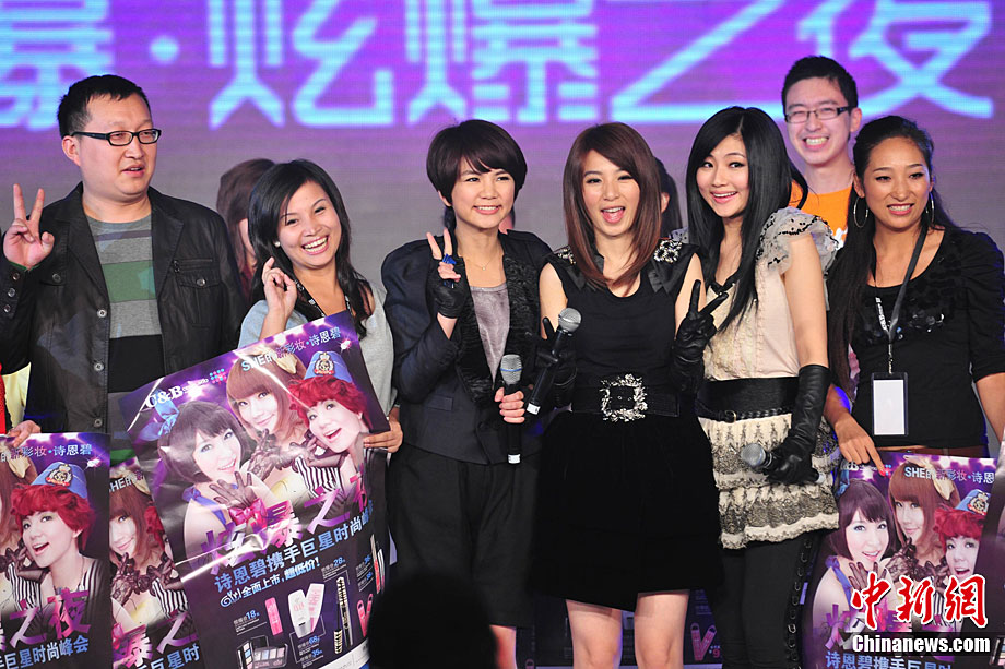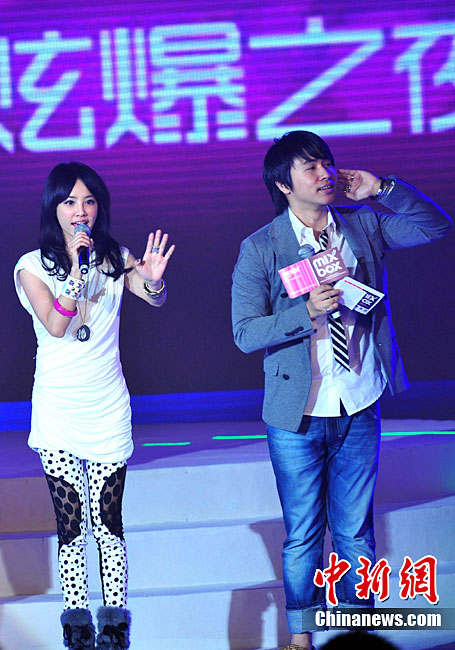 10月12日,美爆·炫爆之夜巨星時尚盛典在北京舉行。華語樂壇天后級明星蔡依林、SHE、BY2閃亮出席。蔡依林現場當起舞蹈老師教舞,主持人歐弟身手笨拙搞笑摔倒。中新社記者 李學仕 攝
