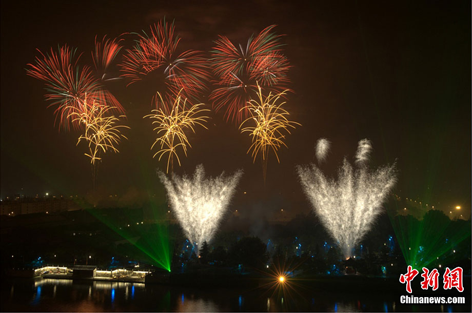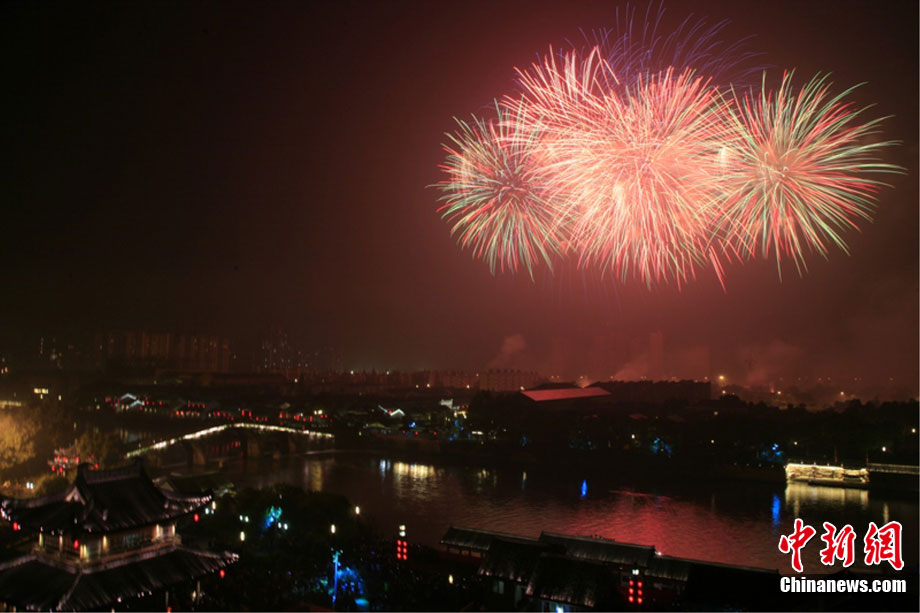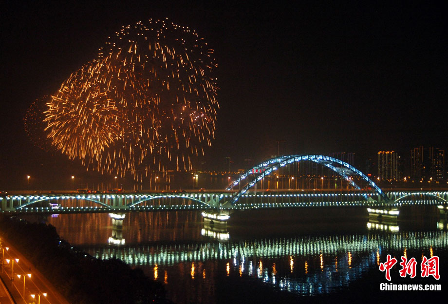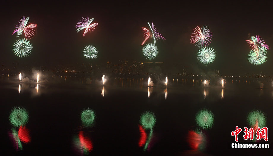 10月16日,作為2010杭州國際煙花大會分會場,璀璨旖旎的煙花再次在運河上空綻放。16萬發(fā)煙花持續(xù)近40分鐘的燃放再次點亮千年運河的夜空,上演一場夢幻般的視覺盛宴。中新社發(fā) 夏毅 攝