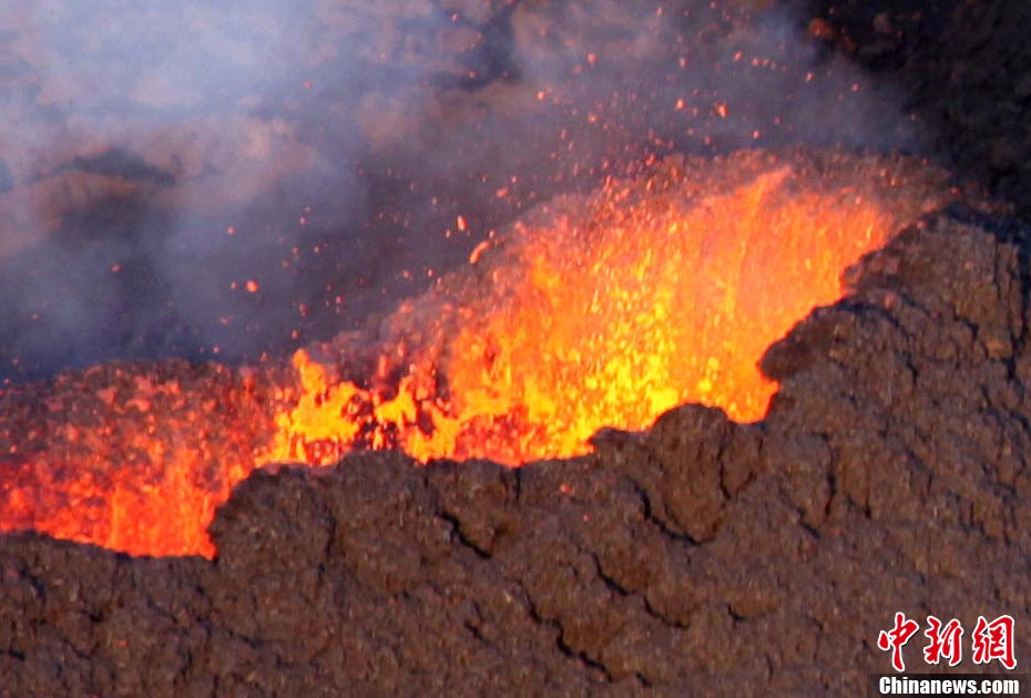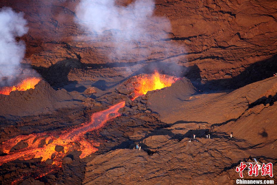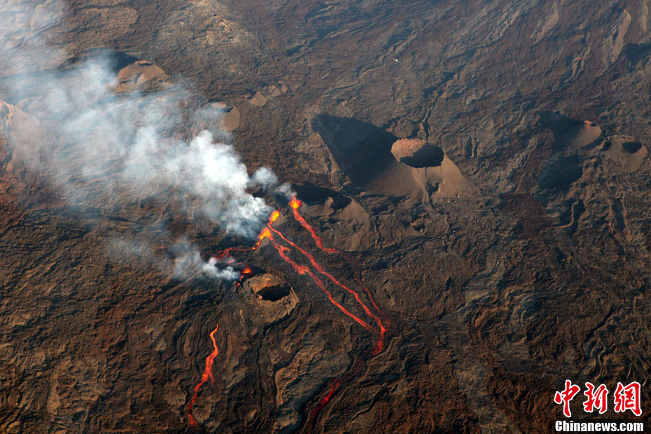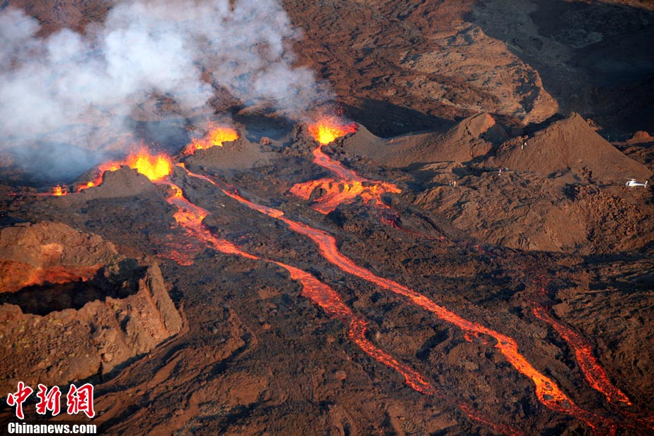 2010年10月14日,法國留尼旺島上的弗爾乃斯火山(Piton de la Fournaise)開始噴發(fā)熔巖流。圖為鳥瞰該火山噴發(fā)出的熔巖流。位于印度洋西南部的弗爾乃斯火山是世界上最活躍的活火山之一。