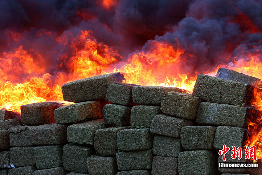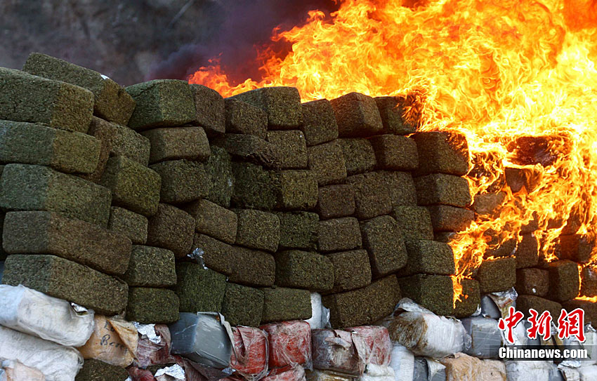 當?shù)貢r間10月20日,墨西哥在北部邊境城市蒂華納的一個軍營內集中銷毀了在北部邊境繳獲的134噸大麻。