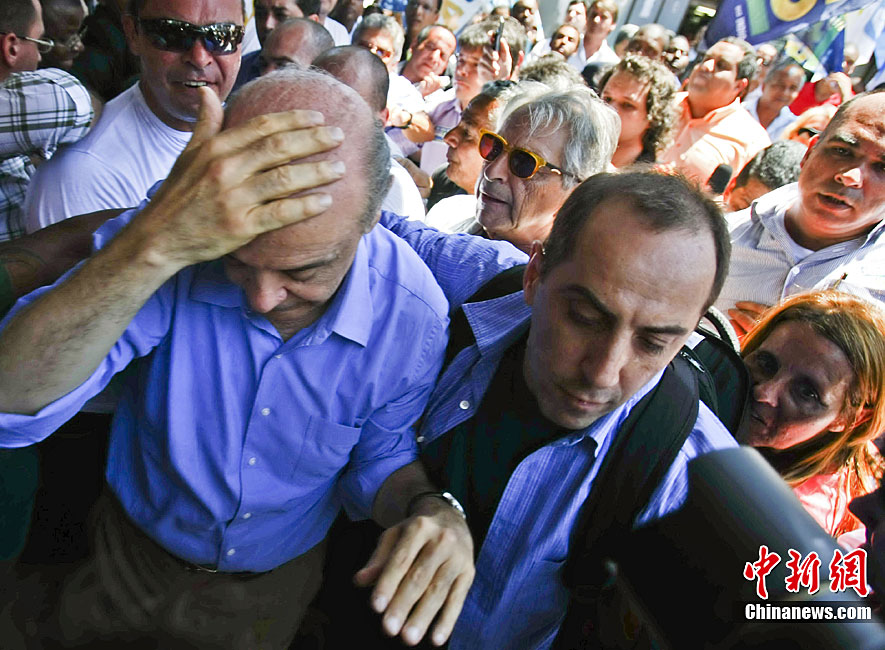 當(dāng)?shù)貢r(shí)間10月20日,在巴西里約熱內(nèi)盧以西,社會(huì)民主黨總統(tǒng)候選人若澤·塞拉在參加一場(chǎng)競(jìng)選宣傳活動(dòng)時(shí)被不明投擲物擊中頭部,隨后在安保人員和支持者的護(hù)送下離開(kāi)了現(xiàn)場(chǎng)。