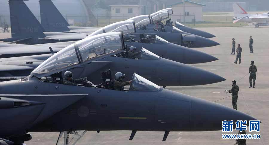 韓國與美國空軍于本月15日開始在朝鮮半島西部空域舉行代號為“最響雷鳴”的“常規(guī)空軍演練”,演習(xí)歷時8天,旨在加強兩國空軍相互協(xié)同能力。這是韓美今年夏天以來就“天安”號事件實施的系列聯(lián)合軍演之一。250多名飛行員將參加演習(xí)。包括韓國空軍F—15K和KF—16系列戰(zhàn)斗機、美國空軍F—16型“戰(zhàn)隼”式和KC—135型“同溫層油船”式在內(nèi),大約50架戰(zhàn)斗機參加演習(xí)。樸真熙 攝