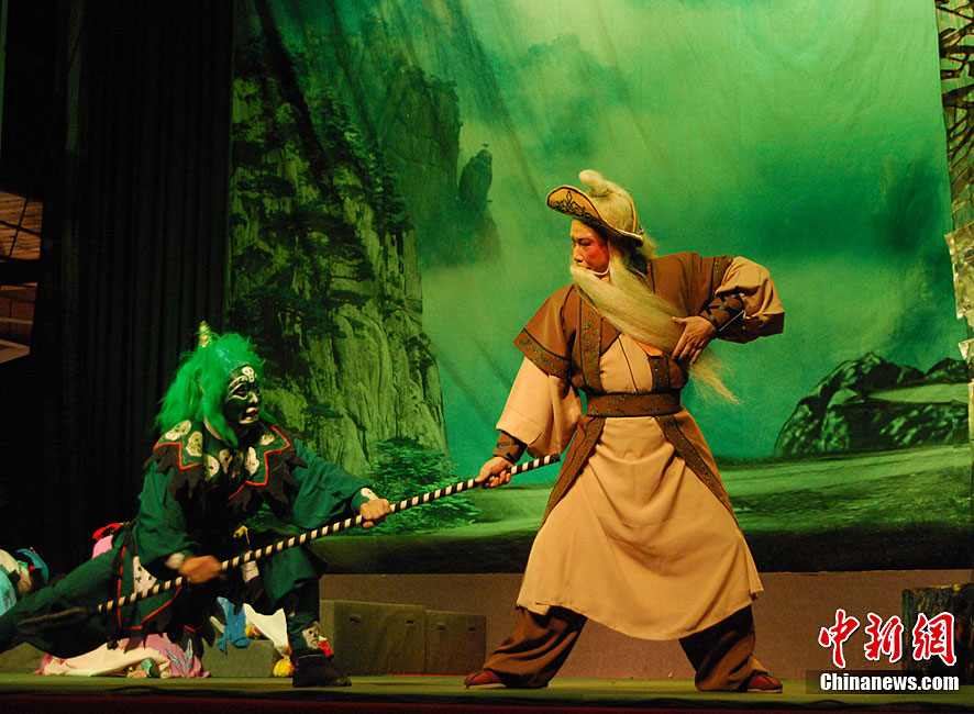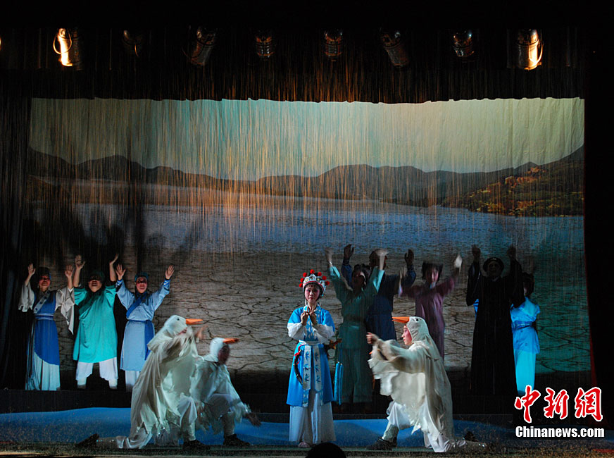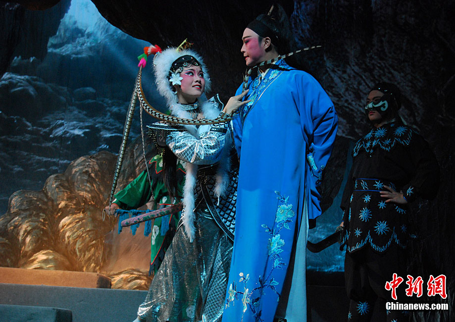 10月22日晚,中國首屆臨水夫人陳靖姑文化學(xué)術(shù)研討會(huì)獻(xiàn)演劇目,大型神話閩劇《臨水夫人陳靖姑》在陳靖姑祖廟所在地——福建古田精彩上演。該劇由古田縣閩劇團(tuán)演出,共有《陳靖姑出世》、《蛇鬼禍害》、《延婚離家》、《結(jié)義學(xué)法》、《婚禮劍影》、《蛇鬼陰謀》、《哭別嬰兒》、《閩江祈雨》、《得道臨水》、《天上人間》10個(gè)場次,講述了陳靖姑降妖除魔、救助婦孺的感人事跡。兩岸媽祖宮廟代表人和當(dāng)?shù)匦疟姡餐^看了此次演出。李松 攝