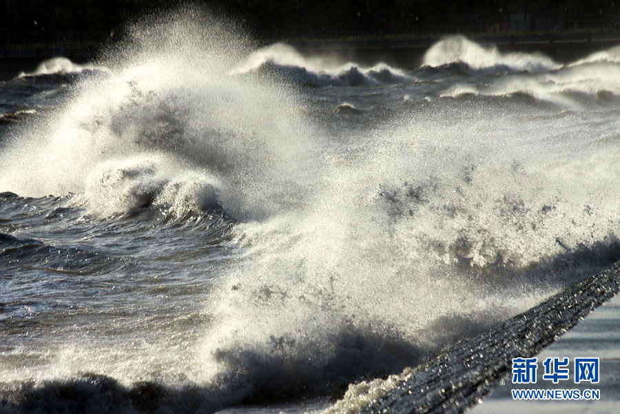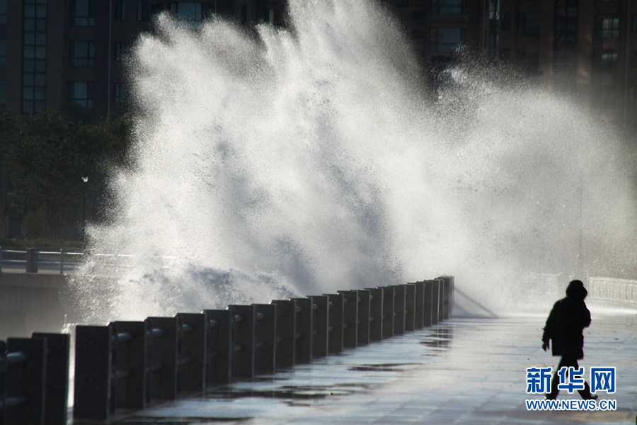 10月25日,一名行人從山東威海海濱掀起的浪花旁走過。當(dāng)日,受強冷空氣影響,山東威海海上風(fēng)力達(dá)8至9級,陣風(fēng)風(fēng)力達(dá)到11級,海濱大浪排空,威海市海上搜救中心發(fā)布海上風(fēng)險黃色預(yù)警。于啟波 攝 圖片來源:新華網(wǎng)