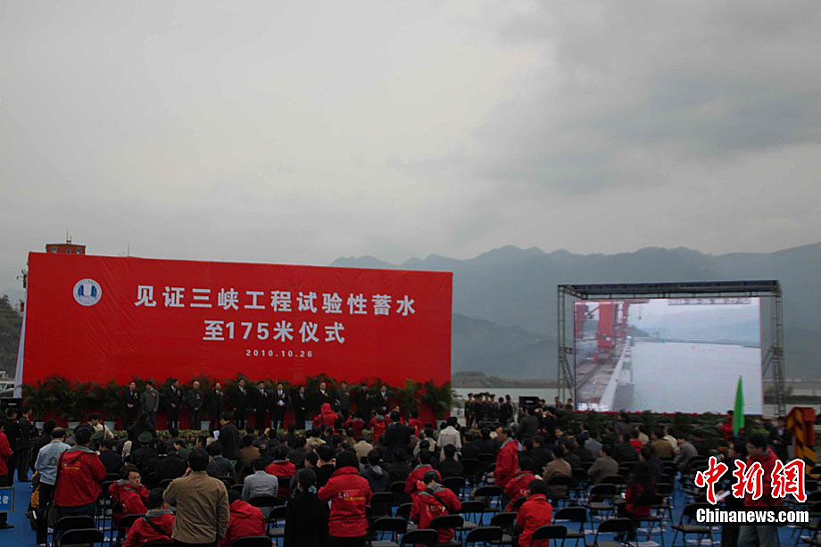 10月26日上午8時30分,在三峽大壩壩頂舉行了“見證三峽工程試驗性蓄水至175米儀式”,8時55分,中國長江三峽集團公司董事長曹廣晶宣布,三峽工程首次達到175米正常蓄水位,這標志三峽工程由初期運行期轉(zhuǎn)入正常運行期。劉良偉 攝