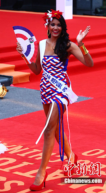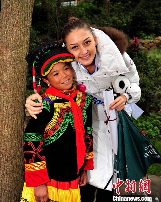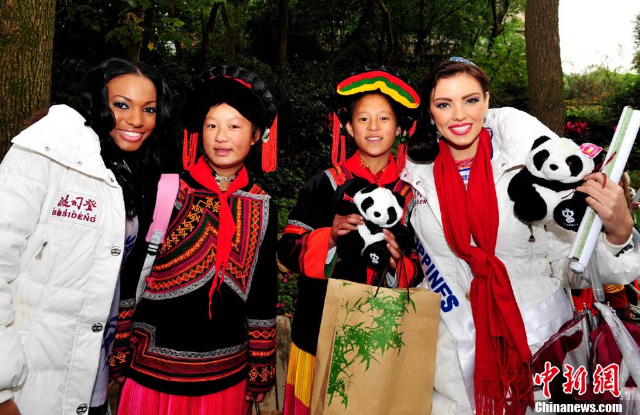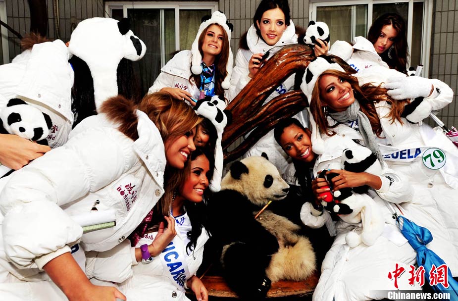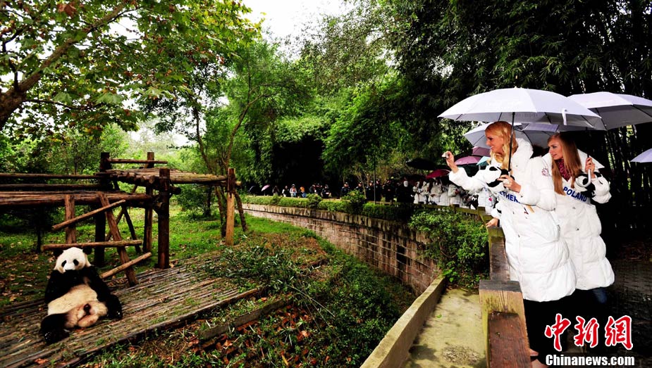 10月26日,參加第50屆國際小姐世界大會全球總決賽的70多位佳麗,來到成都市大熊貓繁育研究基地,參加擁抱熊貓嬌子活動。 中新社發(fā) 安源 攝