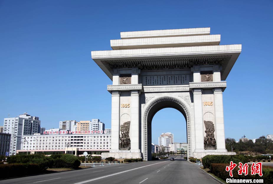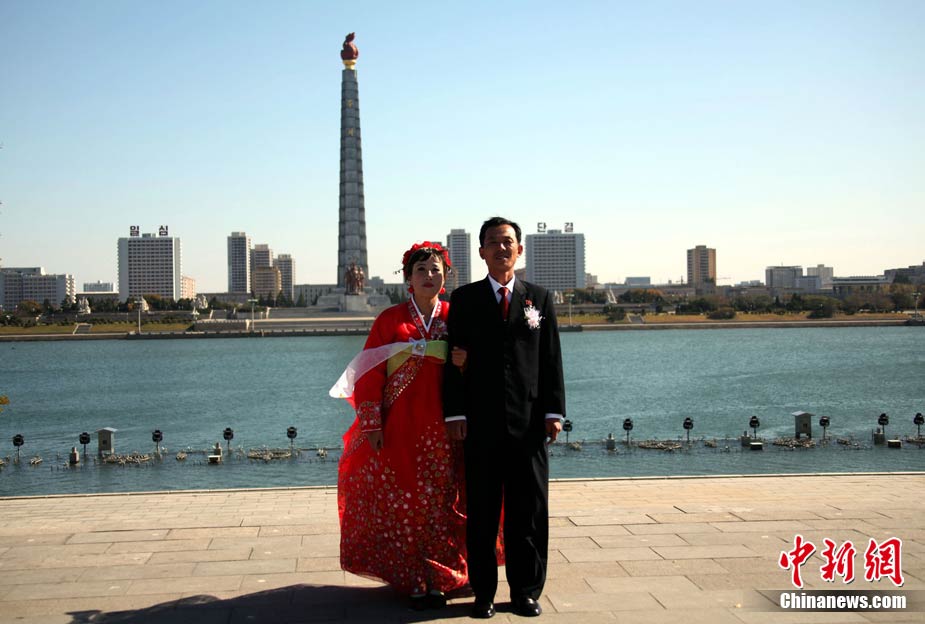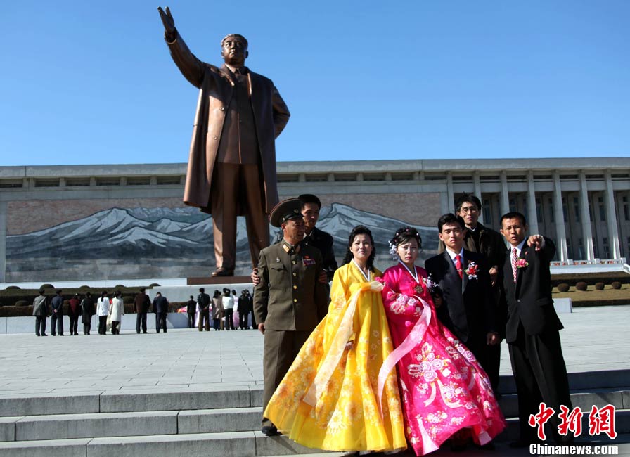 10月26日,朝鮮平壤街頭陽光明媚、秋高氣爽,一對(duì)對(duì)新人來到市中心的萬壽臺(tái),向金日成銅像獻(xiàn)花,并在偉人銅像前合影留念。中新社記者 孫自法 攝