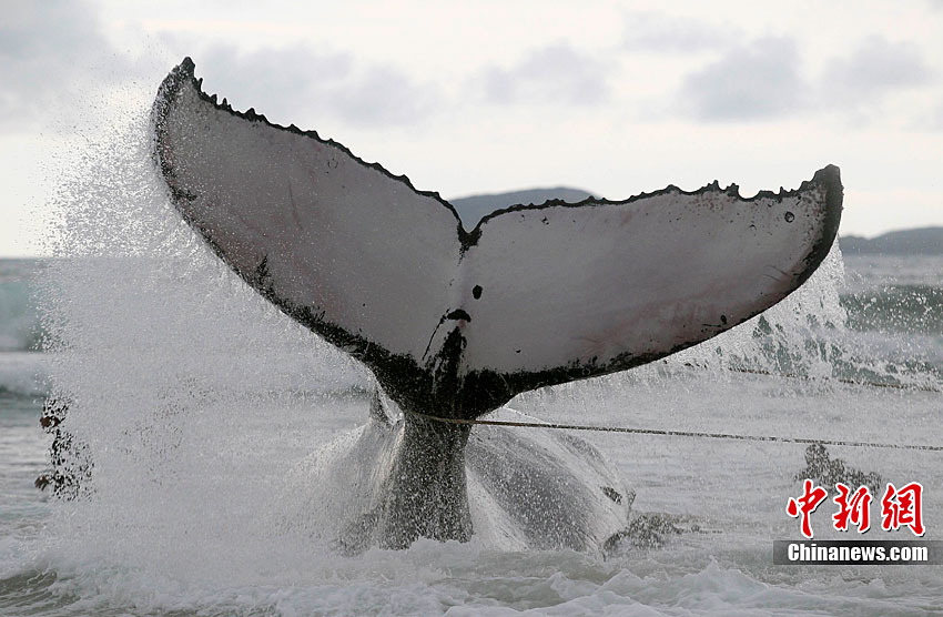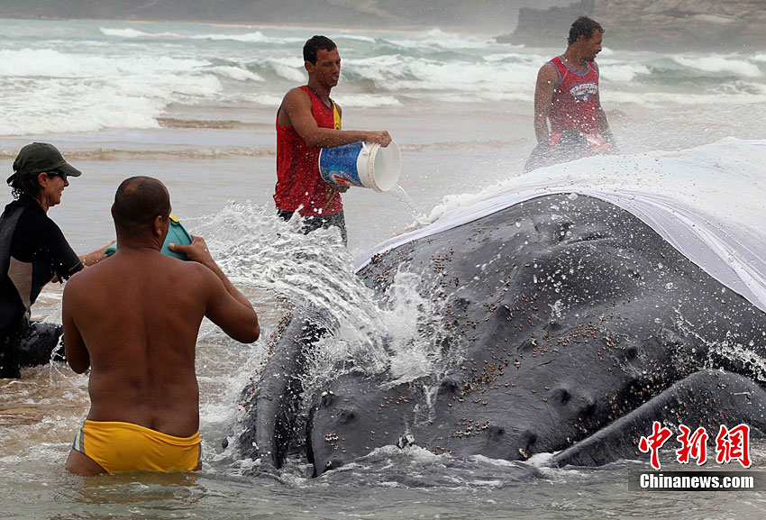 當(dāng)?shù)貢r(shí)間10月26日,在距離巴西里約熱內(nèi)盧192公里的布濟(jì)烏斯,救援人員試圖挪動(dòng)擱淺的座頭鯨。座頭鯨每年7月到11月從南極洲向北遷往巴西海域交配。