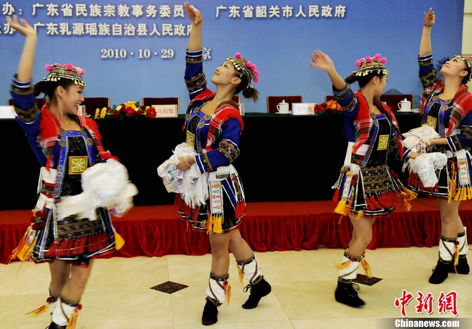 10月29日,第十一屆中國(guó)瑤族盤(pán)王節(jié)新聞發(fā)布會(huì)暨世界過(guò)山瑤之鄉(xiāng)——中國(guó)乳源旅游推介會(huì)在人民大會(huì)堂召開(kāi)。本次會(huì)議發(fā)布,世界瑤族人民的盛會(huì)——第十一屆中國(guó)瑤族盤(pán)王節(jié)將于2010年11月20日至22日在廣東乳源瑤族自治縣隆重舉行。瑤族盤(pán)王節(jié)是瑤族人民紀(jì)念其始祖盤(pán)王(盤(pán)瓠)的盛大節(jié)日。圖為“瑤族公主”形象代表身著湘粵桂南嶺地區(qū)的瑤族盛裝亮相新聞發(fā)布會(huì)。中新社記者 劉震 攝