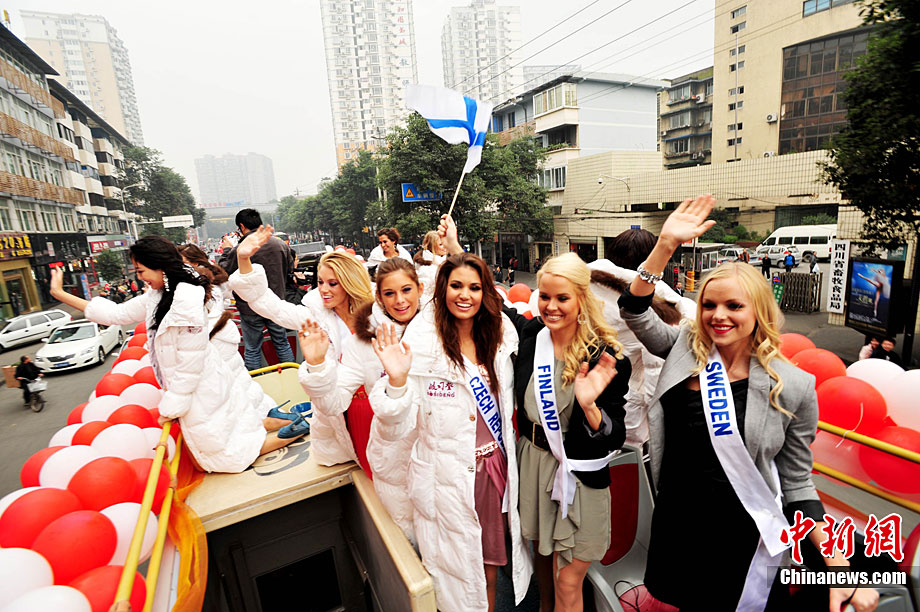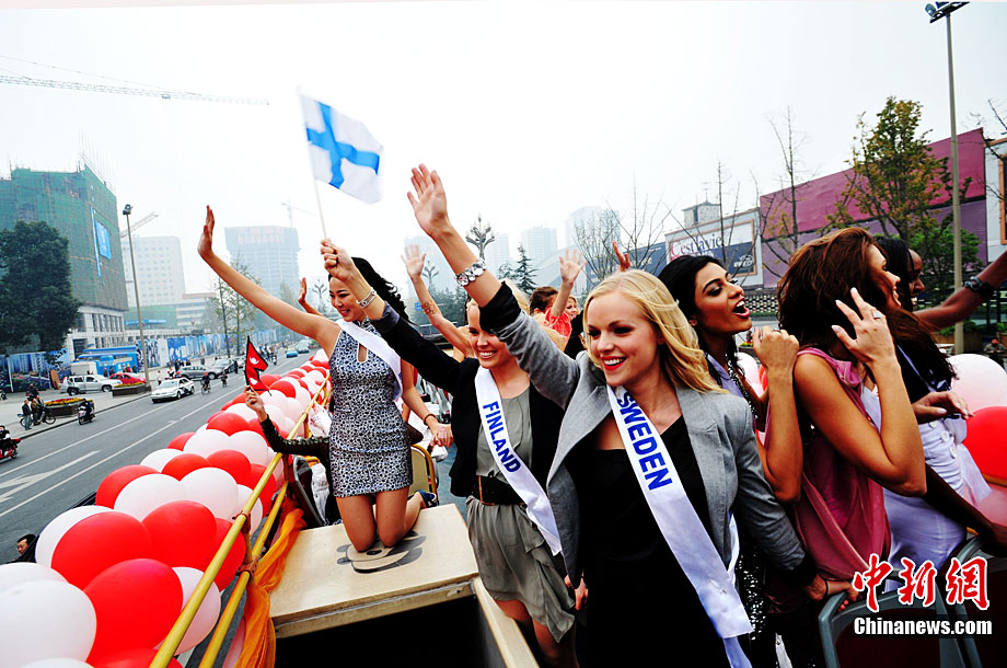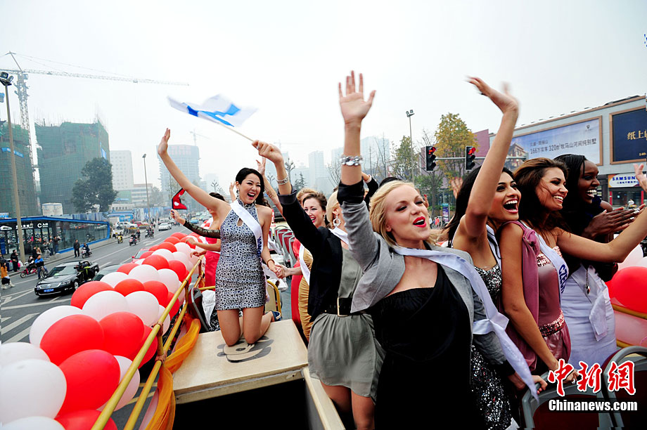 10月31日,國際小姐世界大會全球總決賽的70位參賽佳麗花車巡游成都市區(qū)。中新社發(fā) 安源 攝