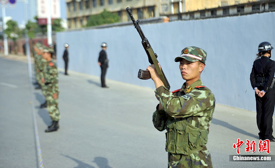 11月11日下午,為提高監(jiān)獄安全防范和及時有效處置突發(fā)事件的能力,廣西監(jiān)獄局組織駐南寧監(jiān)獄單位進行了制暴追逃預(yù)案應(yīng)急處置實戰(zhàn)演練。本次制暴追逃演練是駐南寧市監(jiān)獄單位和武警、公安交警應(yīng)對突發(fā)事件的首次聯(lián)合大練兵。參與警力達260余人!笆掳l(fā)監(jiān)獄”在周邊監(jiān)獄單位、武警官兵、公安民警的權(quán)利配合下,成功處置4名“罪犯”企圖制造騷亂、趁機越獄脫逃“事件”。中新社記者 蔣雪林 攝