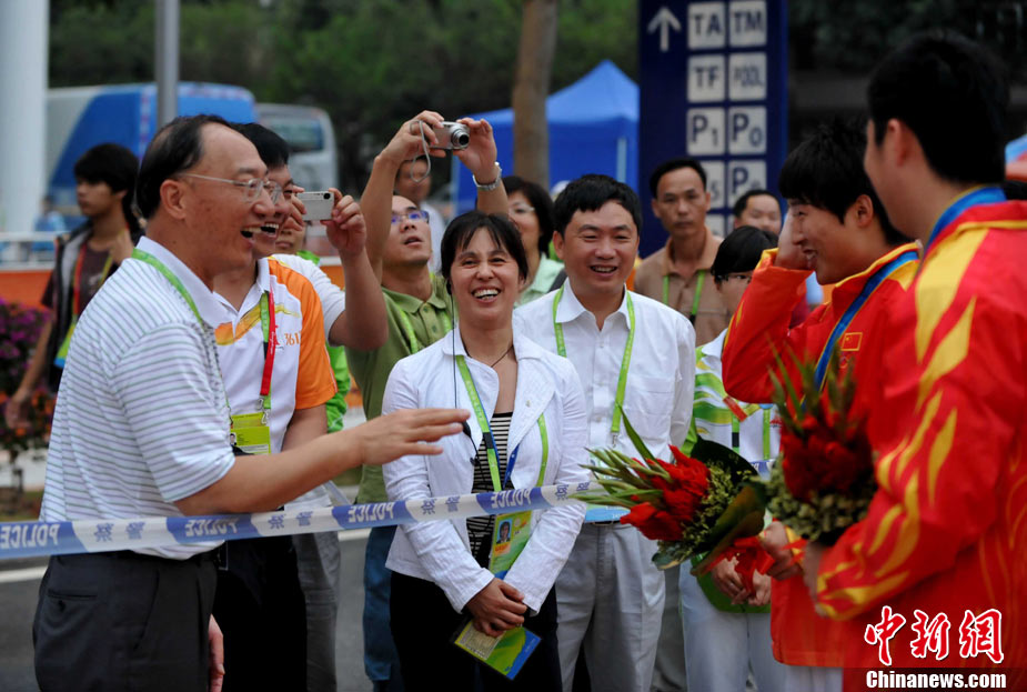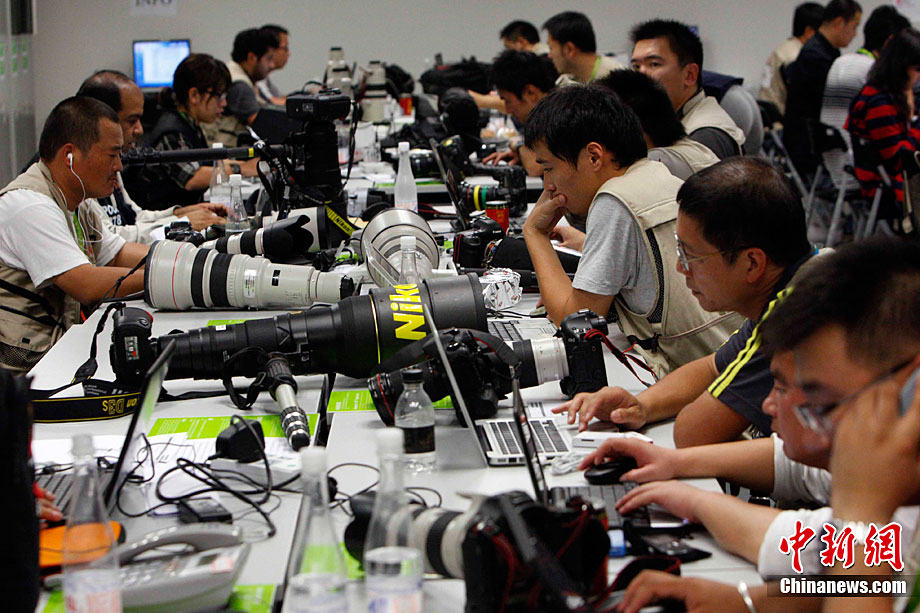 廣州亞運會體操女子團體比賽14日晚結(jié)束,中國隊以234.15分的成績奪冠,成功實現(xiàn)亞運十連冠。比賽結(jié)束后。來自亞洲地區(qū)各家媒體記者紛紛趕往攝影工作間抓緊時間處理稿件,爭取在第一時間將稿子發(fā)出。中新社記者 任海霞 攝