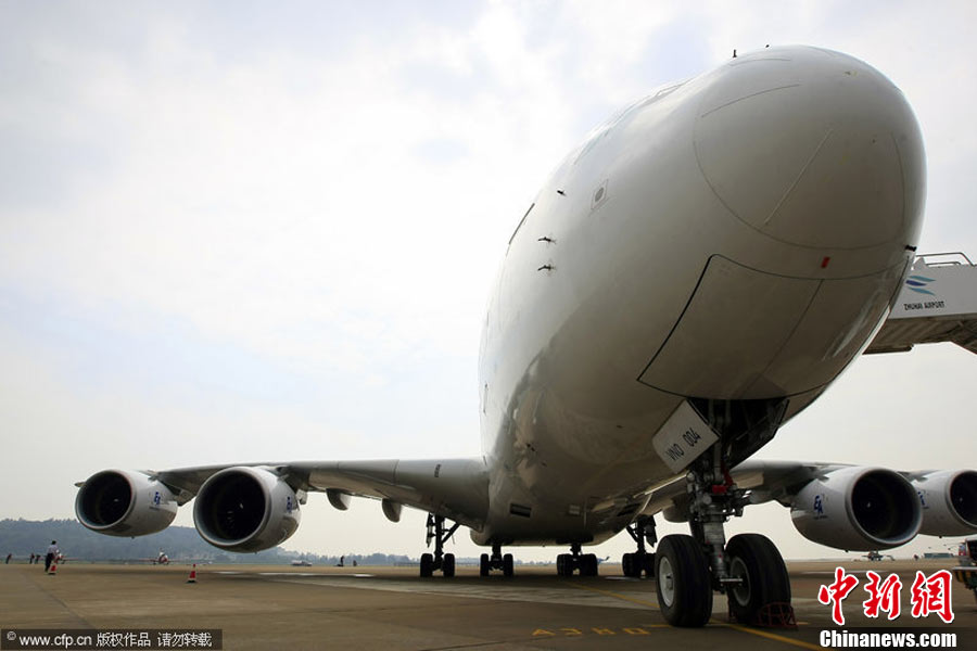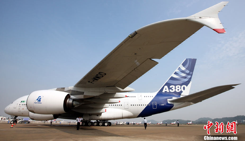 第八屆中國國際航空航天博覽會16日將在珠海開幕。圖為將在航展上亮相的“空中巨無霸”空中客車A380。中新社發(fā) 喬天富 攝 圖片來源:CNSPHOTO