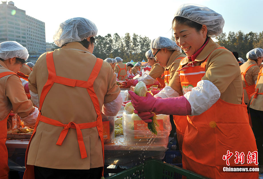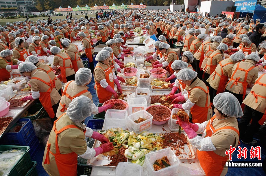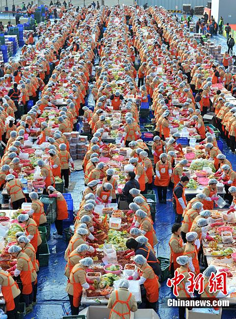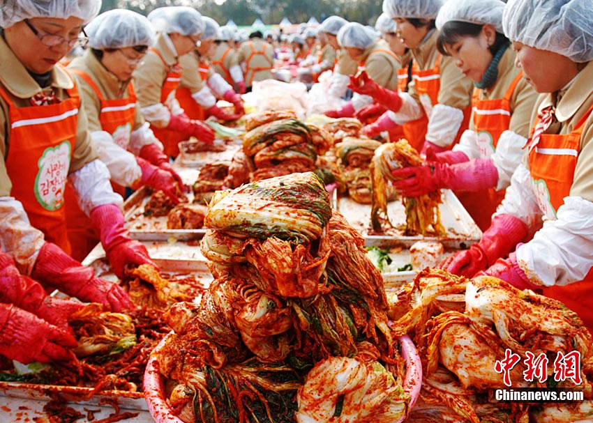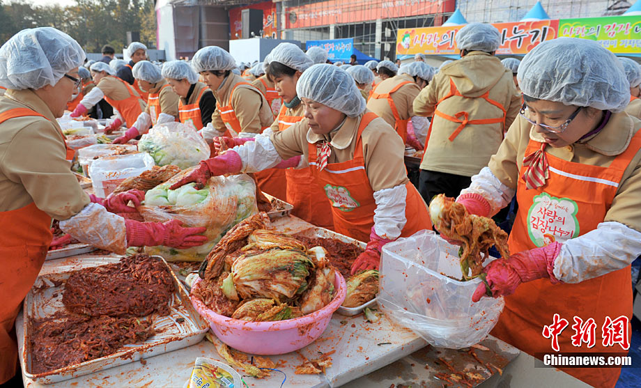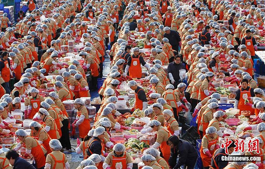 11月16日,幾千名韓國(guó)市民聚集首爾廣場(chǎng),腌制總共12萬(wàn)顆白菜泡菜,贈(zèng)給低收入家庭。泡菜是韓國(guó)最不可或缺的食物,冬季漸近,腌制白菜泡菜更成為韓國(guó)人生活中一件大事。