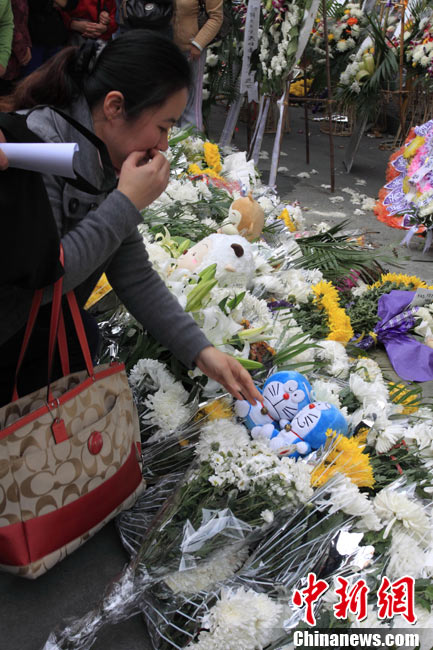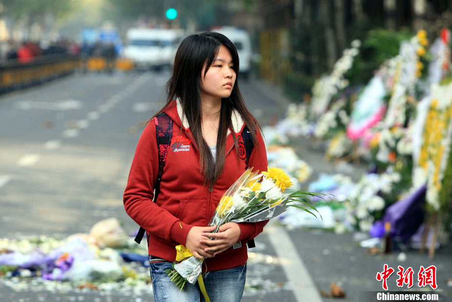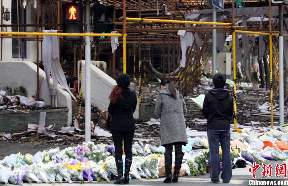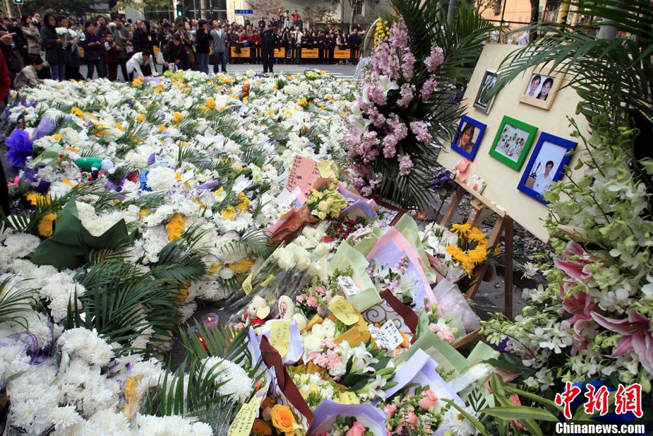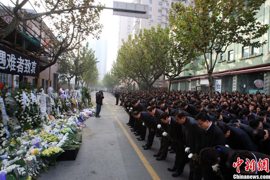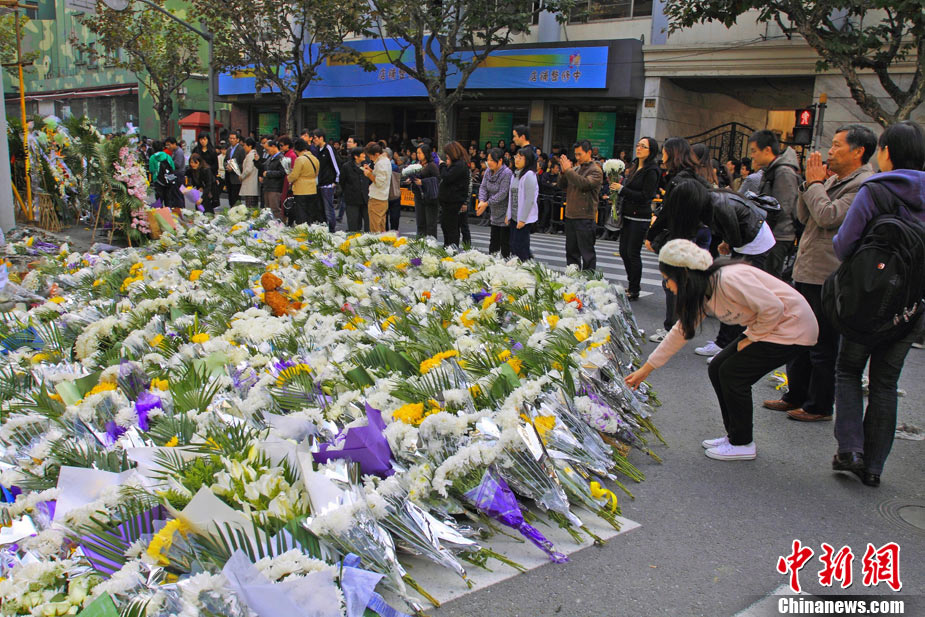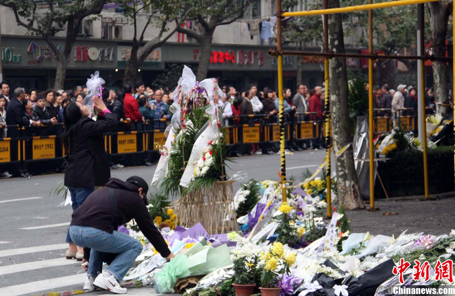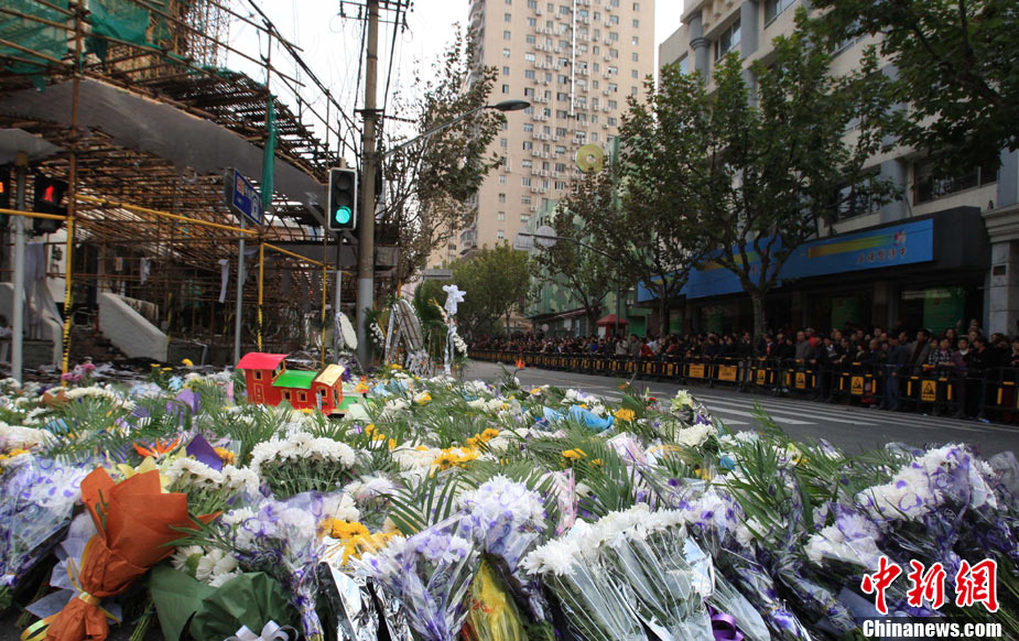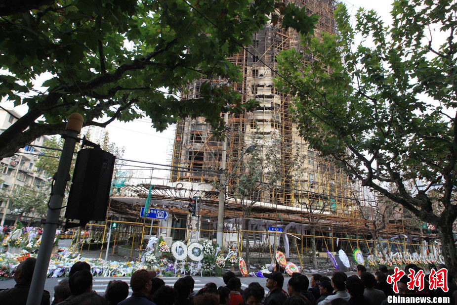 上海“11·15”火災(zāi)大樓現(xiàn)場擺滿悼念鮮花