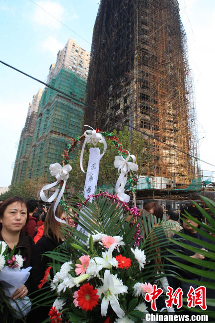 11月18日,在上海膠州路“11·15”火災(zāi)大樓前,擺滿了社會各界民眾悼念逝者的鮮花。中新社記者 潘索菲 攝